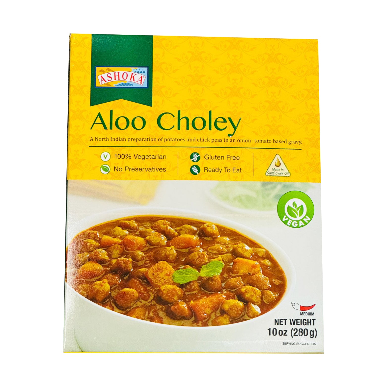 Ashoka Aloo Choley 280g available at Tales of India. A hearty North Indian curry made with potatoes and chickpeas, seasoned with authentic spices – ready in minutes.