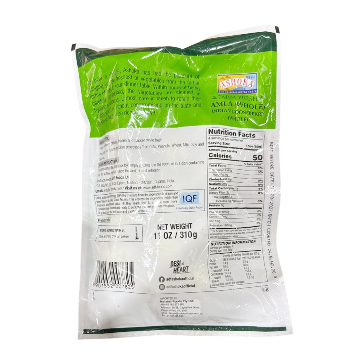 The "Amla whole 310g Ashoka" likely refers to a product containing whole Indian gooseberries (amla) from the brand Ashoka, packaged in a 310g size. These whole fruits are a source of Vitamin C and other nutrients, and are commonly used in Ayurvedic traditions for their health properties. The description is for a physical food product, not a juice or powder, and would be used for consumption as a whole fruit.