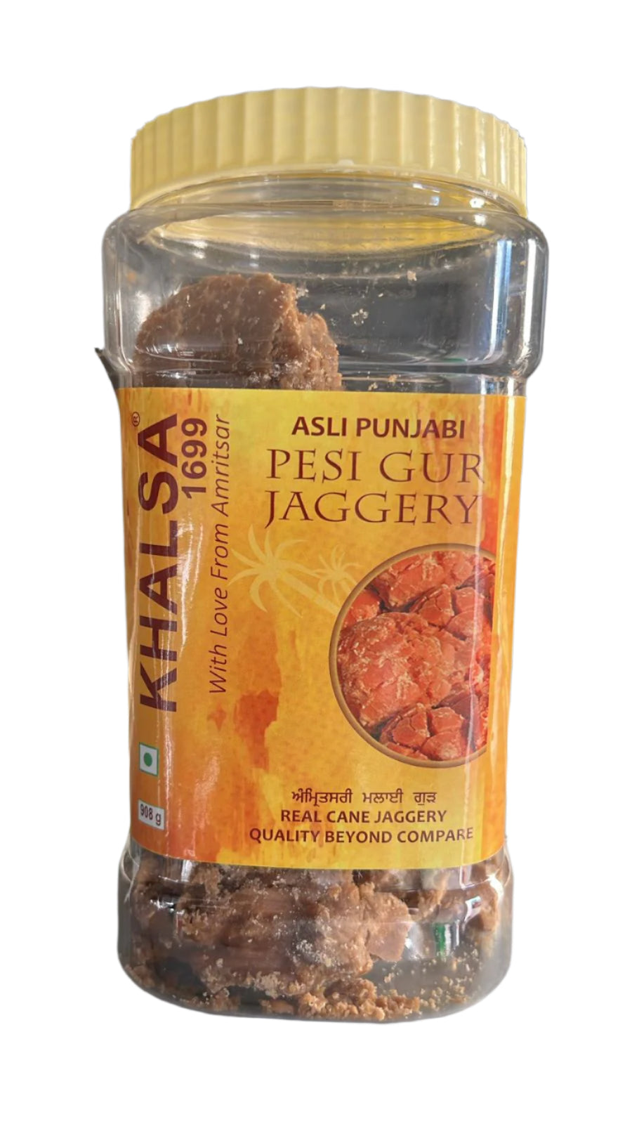 Khalsa 1699 Asli (Pure) Punjabi Pesi Gur Jaggery 908g available at Tales of India. A natural, mineral-rich sweetener perfect for desserts, beverages, and daily use.