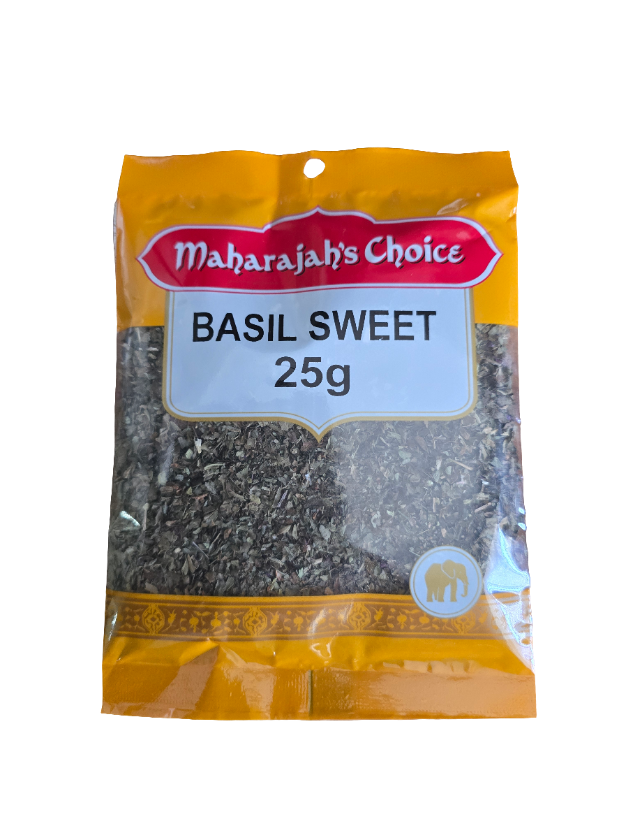 Maharajah's Choice Basil Sweet 25g available at Tales of India. Premium quality sweet basil herb perfect for enhancing the aroma and flavor of your dishes.