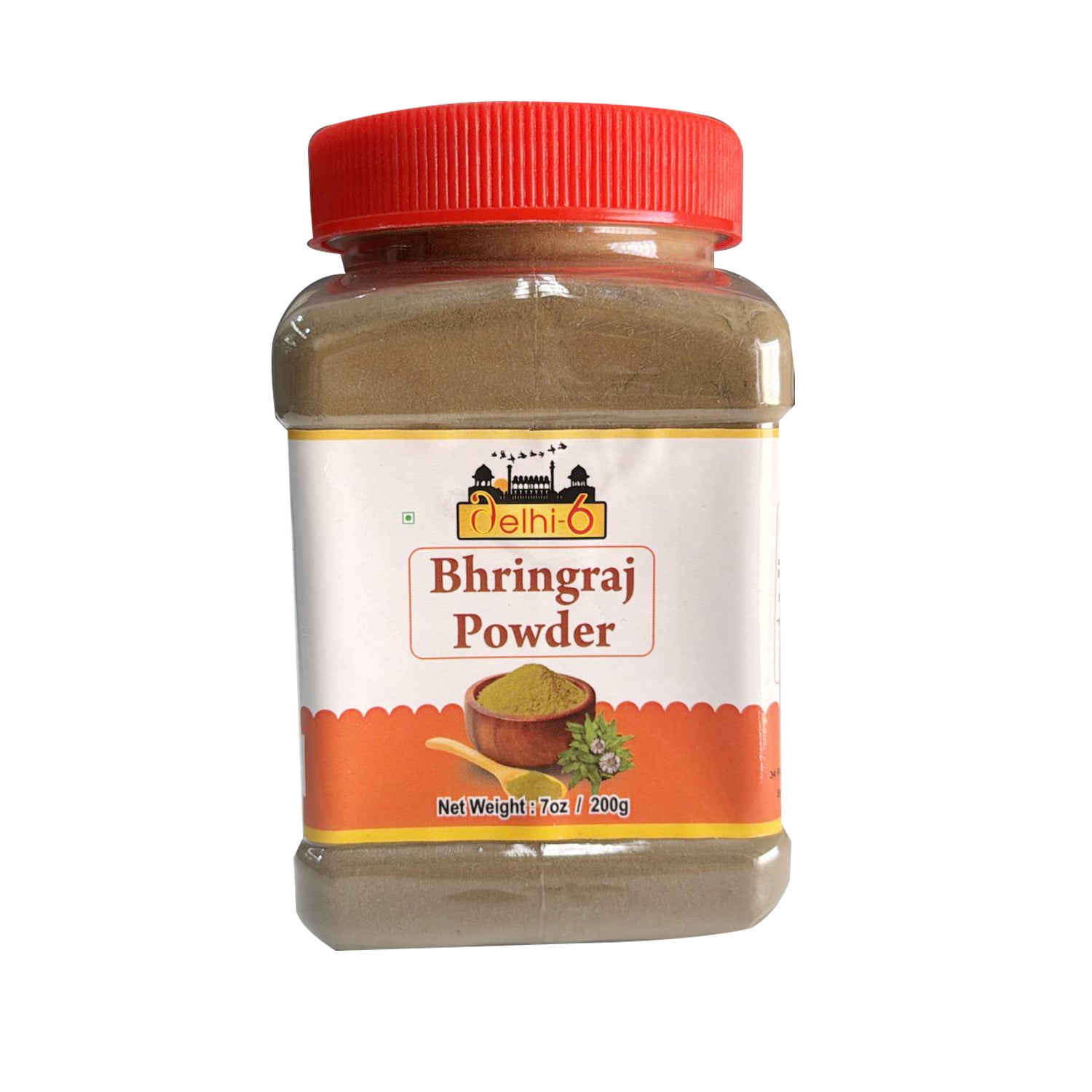 Bhringraj powder, available in a 200g package from Delhi 6, is an Ayurvedic herb known for its benefits to hair health and growth. It's often used as a hair mask to promote hair growth, strengthen hair, and address issues like dandruff and lice. It is also believed to help with skin health and potentially improve vision and menstrual health.
