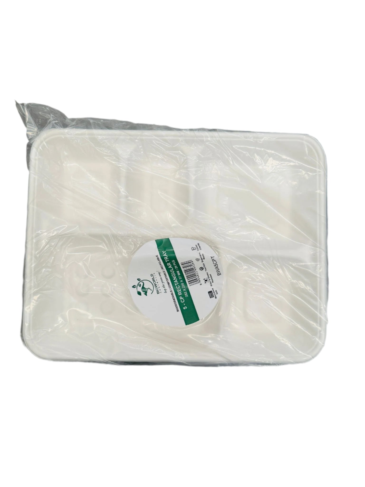 Bioworld Biodegradable 5CP Tray (25) available at Tales of India. Compartment, 100% compostable tray for organized, eco-friendly meal service.
