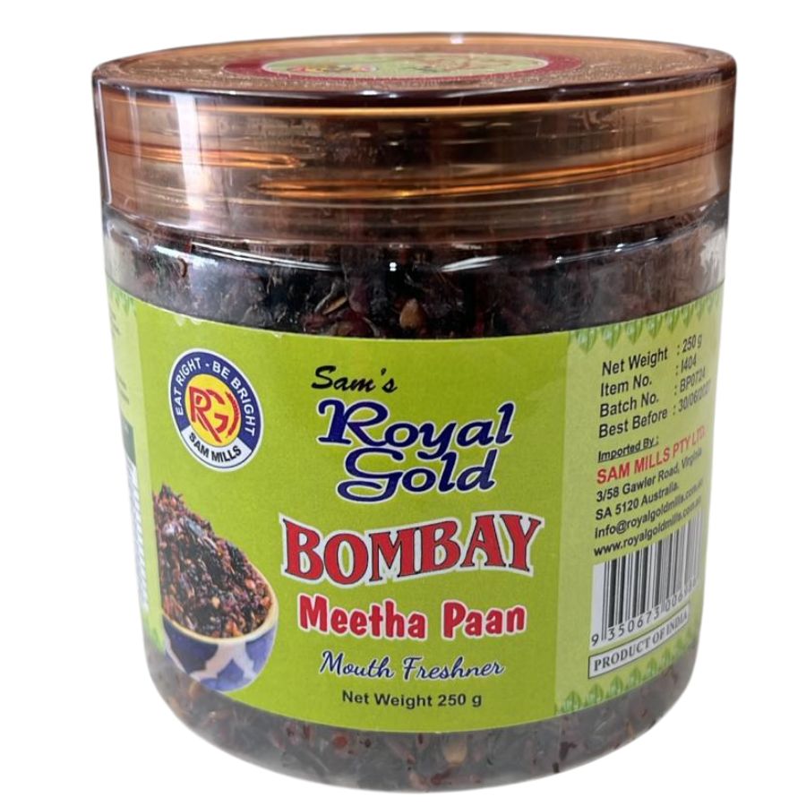 Royal Gold Bombay Mitha Paan 250g available at Tales of India. A delightful and refreshing Indian mouth freshener blended with sweet paan flavors, gulkand, and aromatic ingredients.