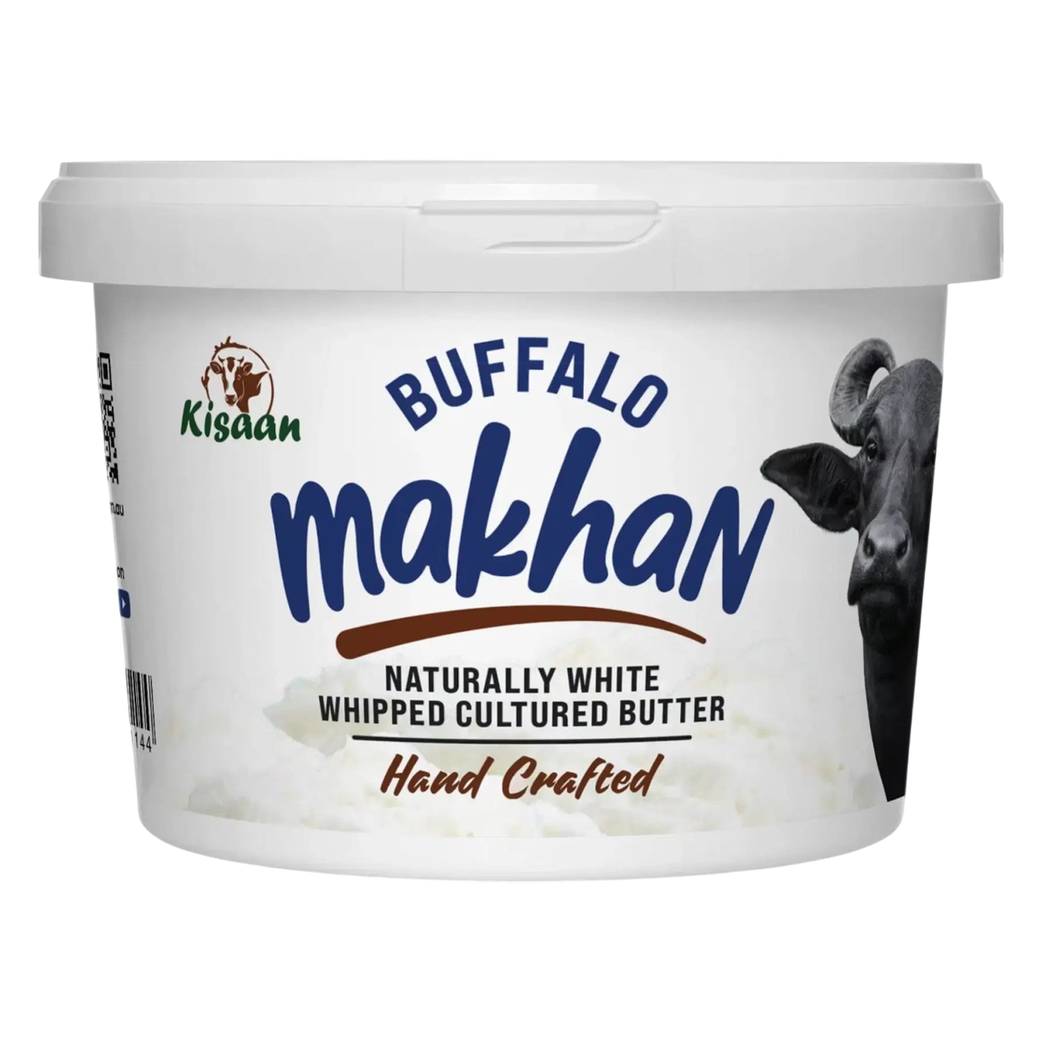 Kisaan's 380g Buffalo Makhan is a smooth, creamy, whipped butter handcrafted from Australian buffalo cultured cream. Designed to taste like traditional homemade makhan, it is promoted as being 100% natural, pure, and fresh