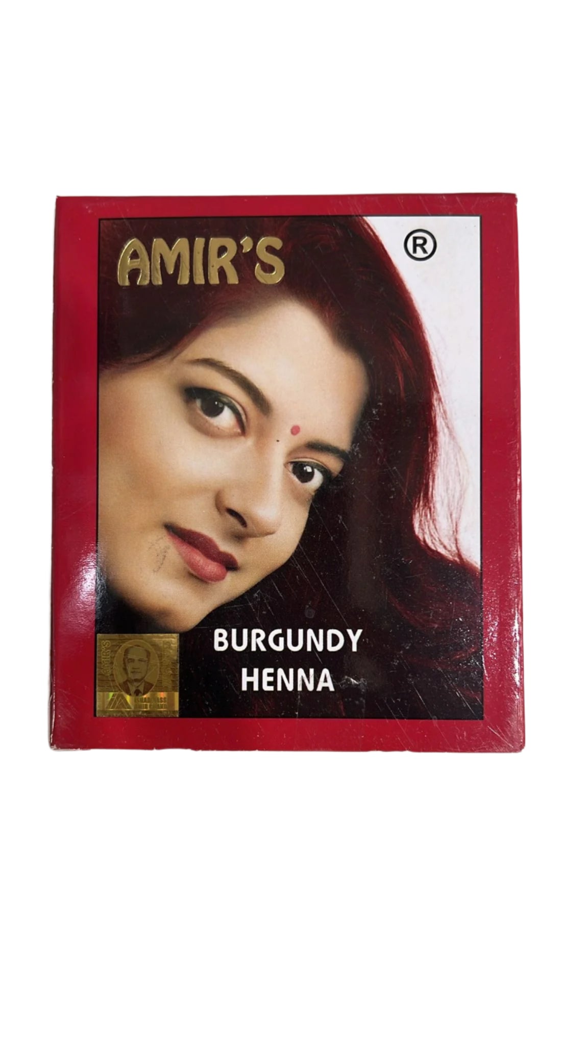 Amir's Burgundy Heena Mehandi Colour 60g available at Tales of India. A natural henna-based hair color that provides deep burgundy shade, shine, and care.
