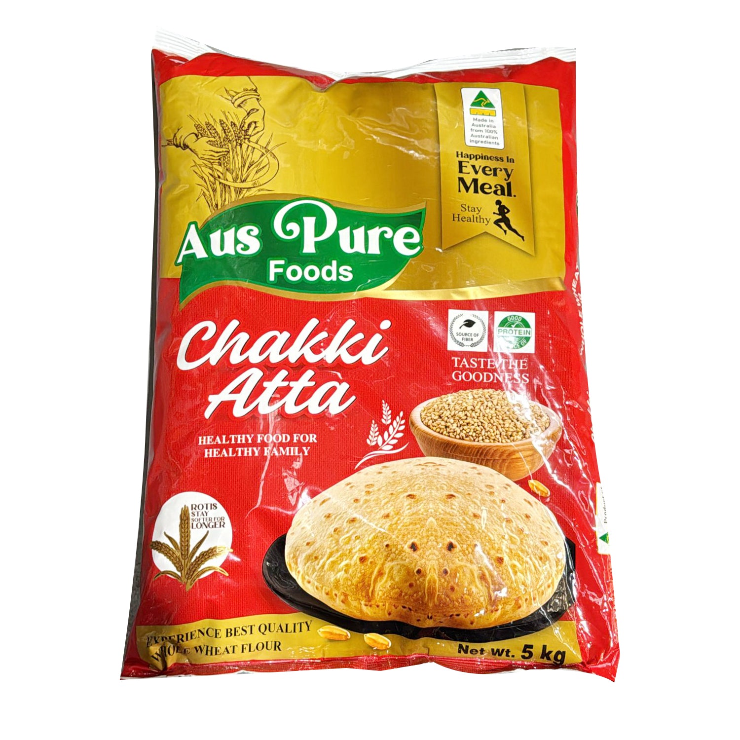 Aus Pure Foods' 5kg Chakki Atta is a traditional, stone-ground whole wheat flour made from high-quality Australian wheat, providing a pure taste, soft rotis, and a good source of fiber and protein. The chakki-grinding process preserves natural nutrients and healthy fats, resulting in a healthy flour with a wholesome flavor, ideal for chapatis, rotis, and other traditional dishes.