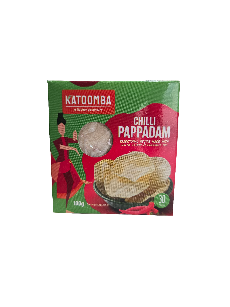 Katoomba Chilli Pappadam 100g available at Tales of India. Spicy and crispy pappadams, perfect for frying or roasting as a snack or side.