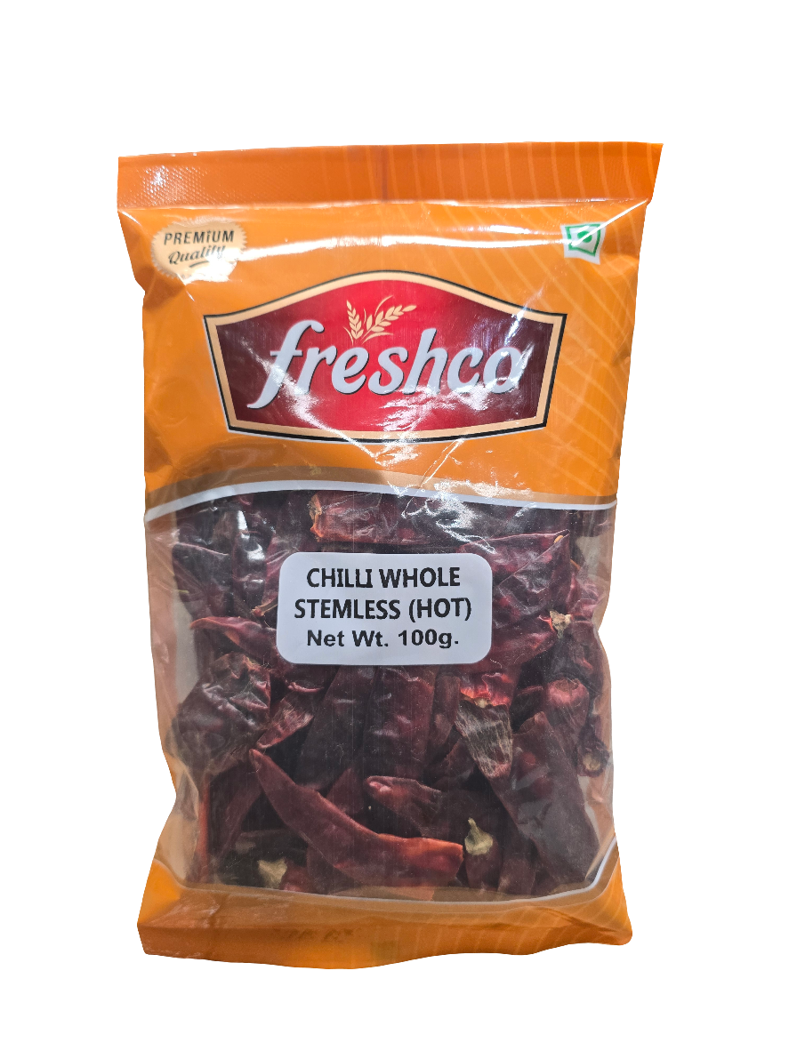 Freshco Chilli Whole Stemless (Hot) 100g available at Tales of India. High-quality whole red chillies perfect for adding heat and flavor to curries, pickles, and traditional Indian dishes.