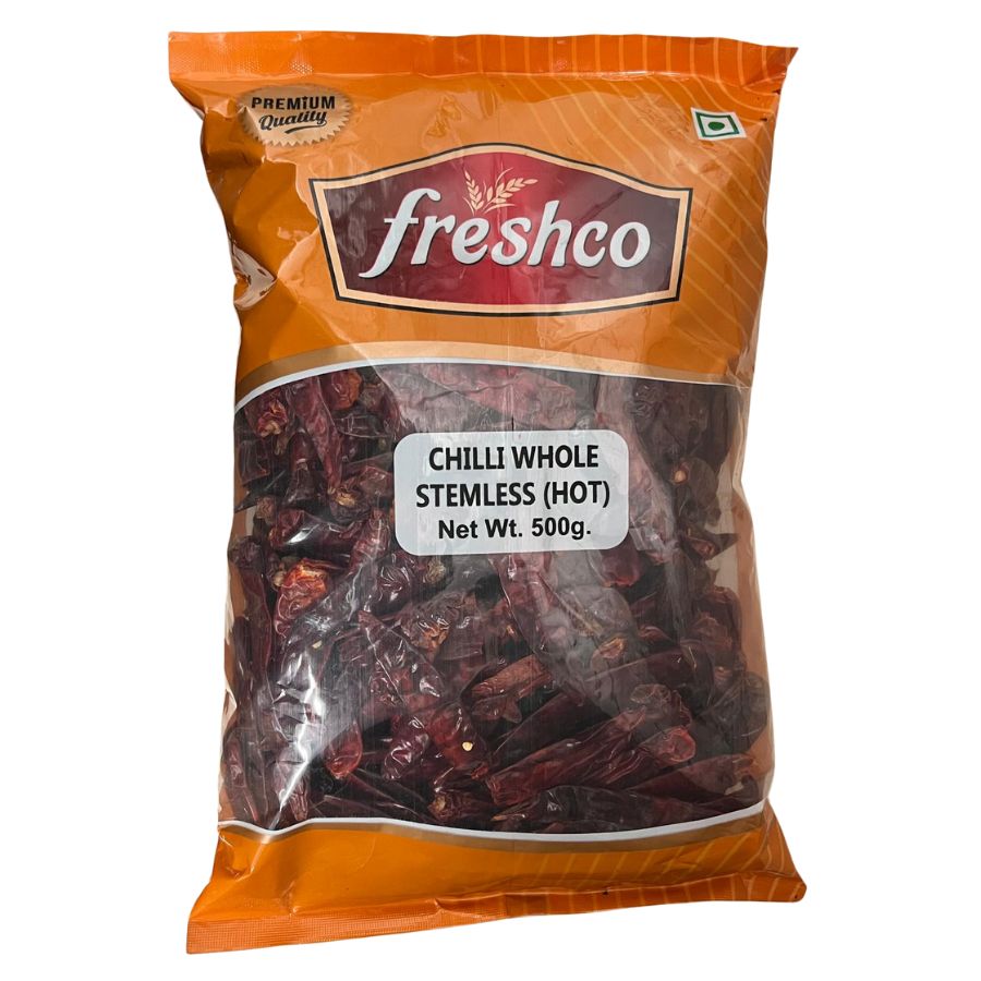 Chilli Whole Stemless (Hot) 500g by Freshco available at Tales of India. Premium quality hot whole chilies to add spice and flavour to your Indian cooking.