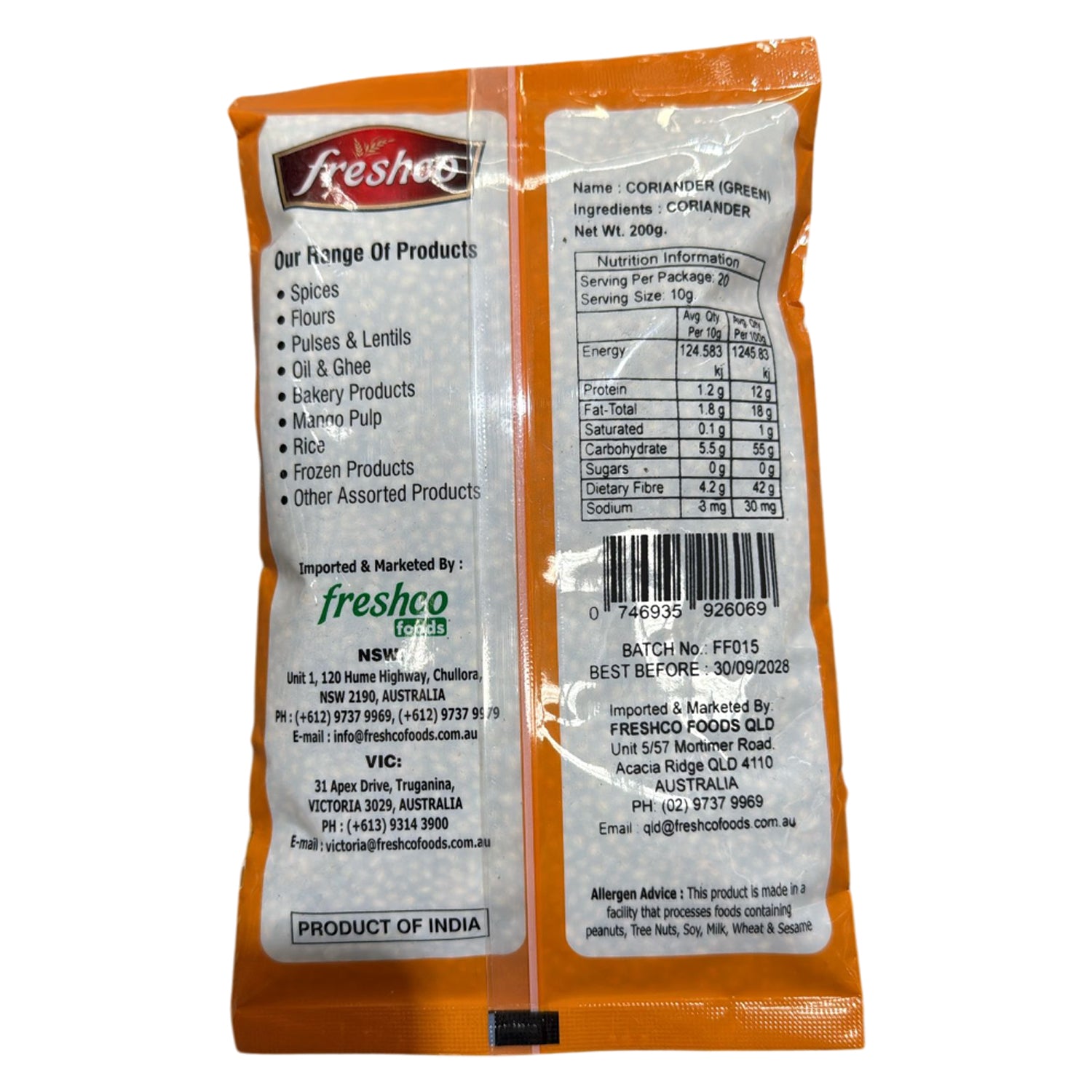 Freshco's 200g green coriander seeds are described as a pantry staple for adding an authentic, warm, and citrusy flavor to a variety of dishes. These whole, aromatic seeds are suitable for Indian, Middle Eastern, and Asian cuisines, and can be used in curries, soups, stews, or dry-roasted before grinding. The description emphasizes quality and freshness, recommending they be stored in an airtight container in a cool, dry place.