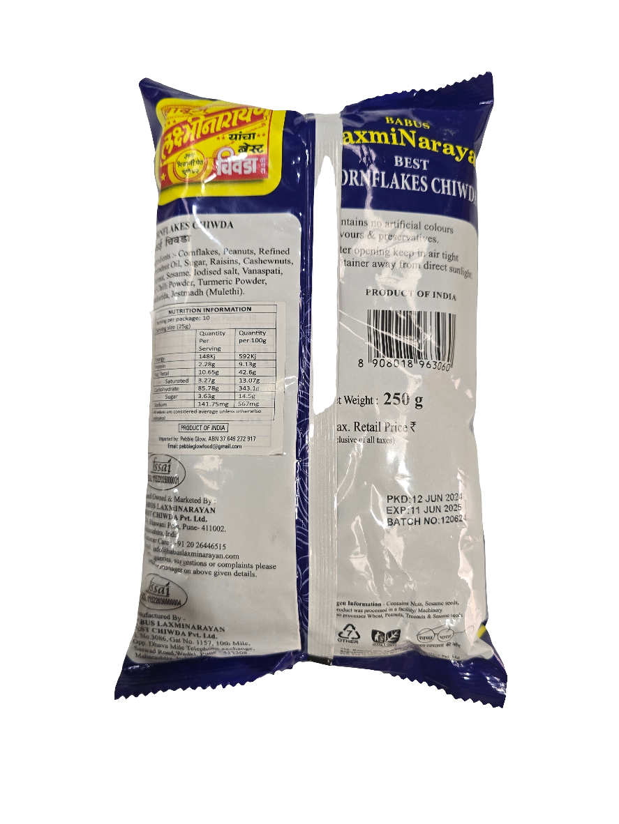 Babus Laxmi Narayan Cornflakes Chiwda 250g available at Tales of India. Light, crispy, and mildly spiced cornflake-based Indian snack perfect for teatime or munching anytime.