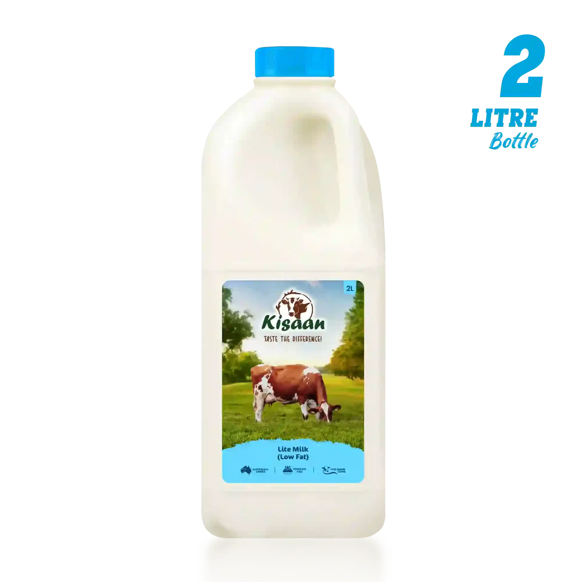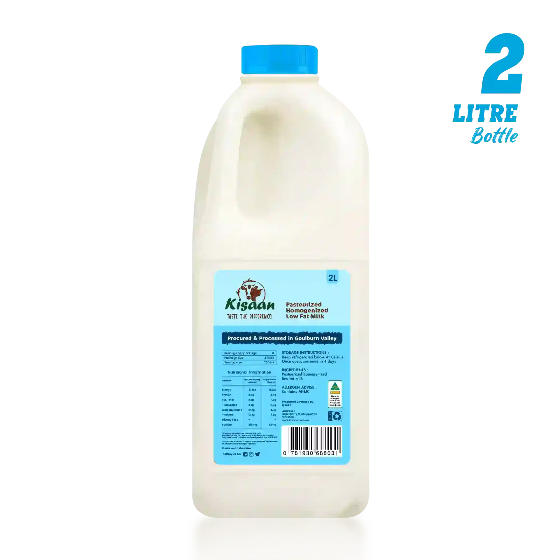 Kisaan Pasteurized Homogenized Low Fat Milk is a 2L bottled product described as rich and velvety, sourced from dedicated farmers. It offers a low-fat alternative while maintaining a creamy texture.