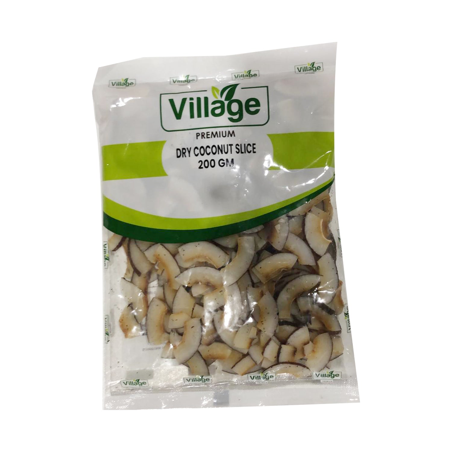 Dry Coconut Slices 200g - Village Made from 100% natural, mature coconut flesh, also known as copra. Free from added preservatives, colors, or sugar. Cut into slices, flakes, or chips, which are dehydrated to remove all moisture and give them a long shelf life. Known for their slightly sweet, pleasant, nutty flavor and aroma. Rich in dietary fiber and essential minerals. Versatile for culinary uses, including sweets, curries, chutneys, and baked goods.