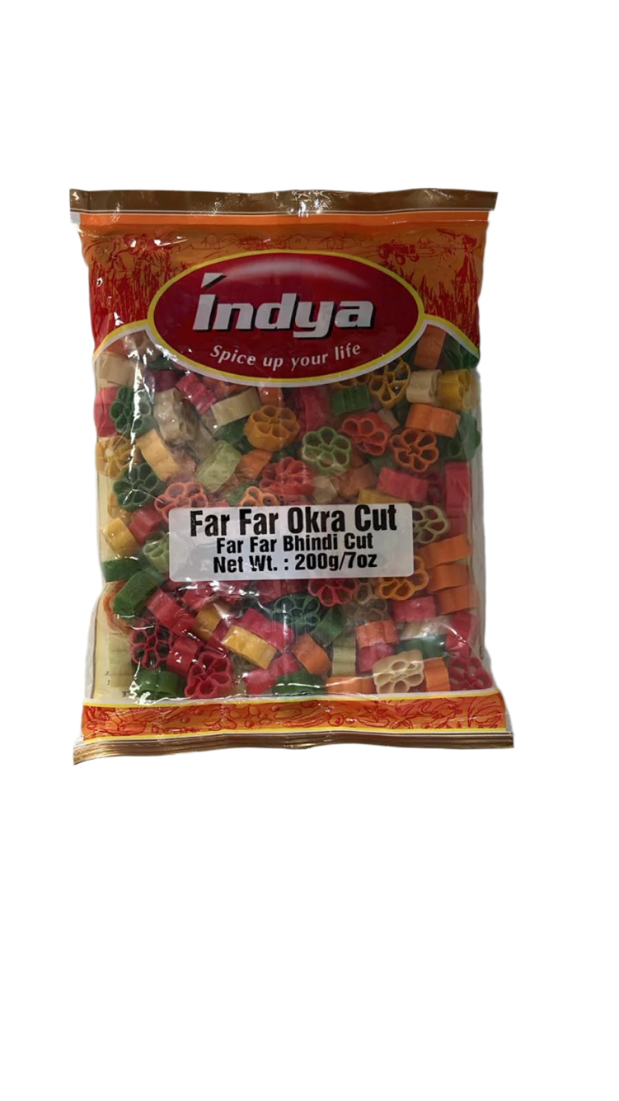 Indya Far Far Okra Cut 200g available at Tales of India. Enjoy crispy and colorful Far Far Bhindi Cut fryums perfect for frying and serving as a light Indian snack.