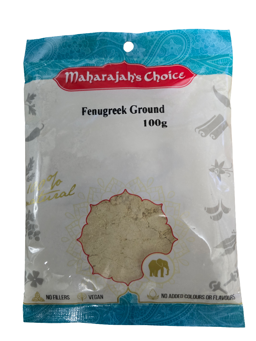 Maharaja Choice Fenugreek Ground 100g available at Tales of India. Aromatic and slightly bitter ground fenugreek ideal for flavoring curries, pickles, sauces, and spice blends in traditional Indian cooking.
