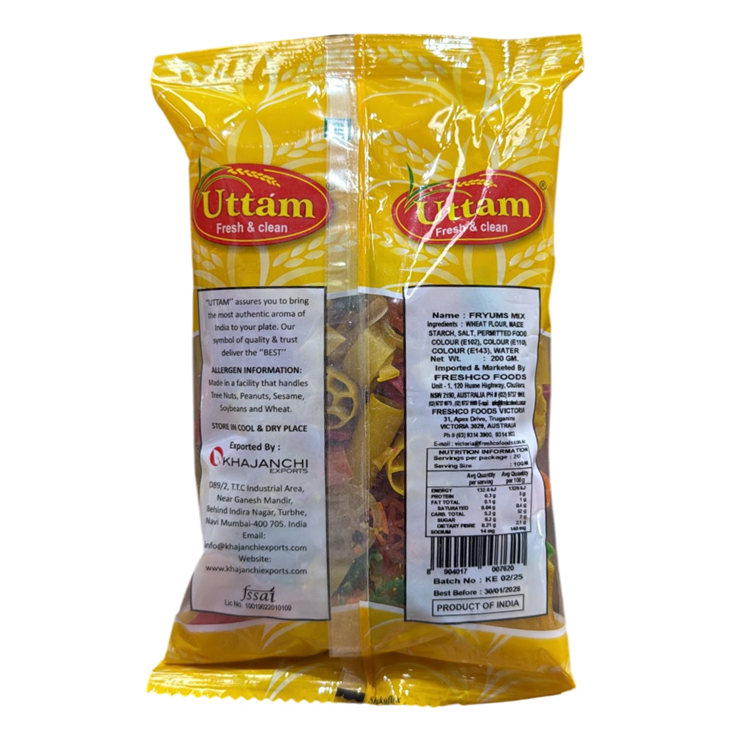 Fryums Yellow Long 200g - Uttam The primary ingredients typically include a mix of flours and starches, such as refined wheat flour (maida), rice flour, tapioca starch, corn starch, along with iodized salt and edible oil. They are generally vegetarian products and often contain no artificial flavors, though they do use synthetic food coloring to achieve the yellow hue