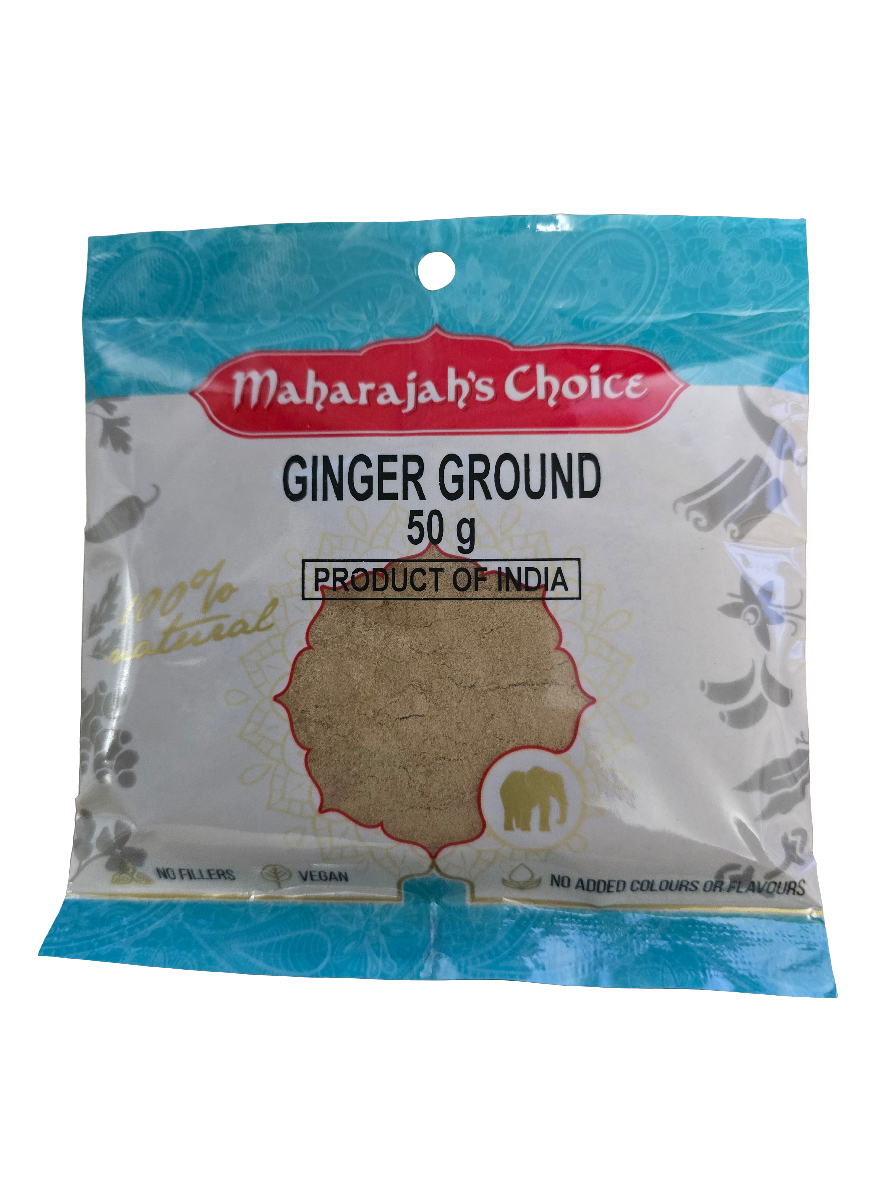 Maharaja Choice Ginger Ground 50g available at Tales of India. Warm and aromatic ground ginger perfect for flavoring curries, teas, baked goods, soups, and marinades.
