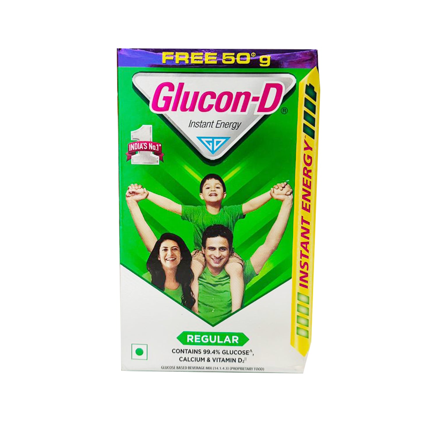 Glucon D Regular 450g available at Tales of India. Instant energy drink powder enriched with calcium and vitamin D for quick energy, hydration, and strength.