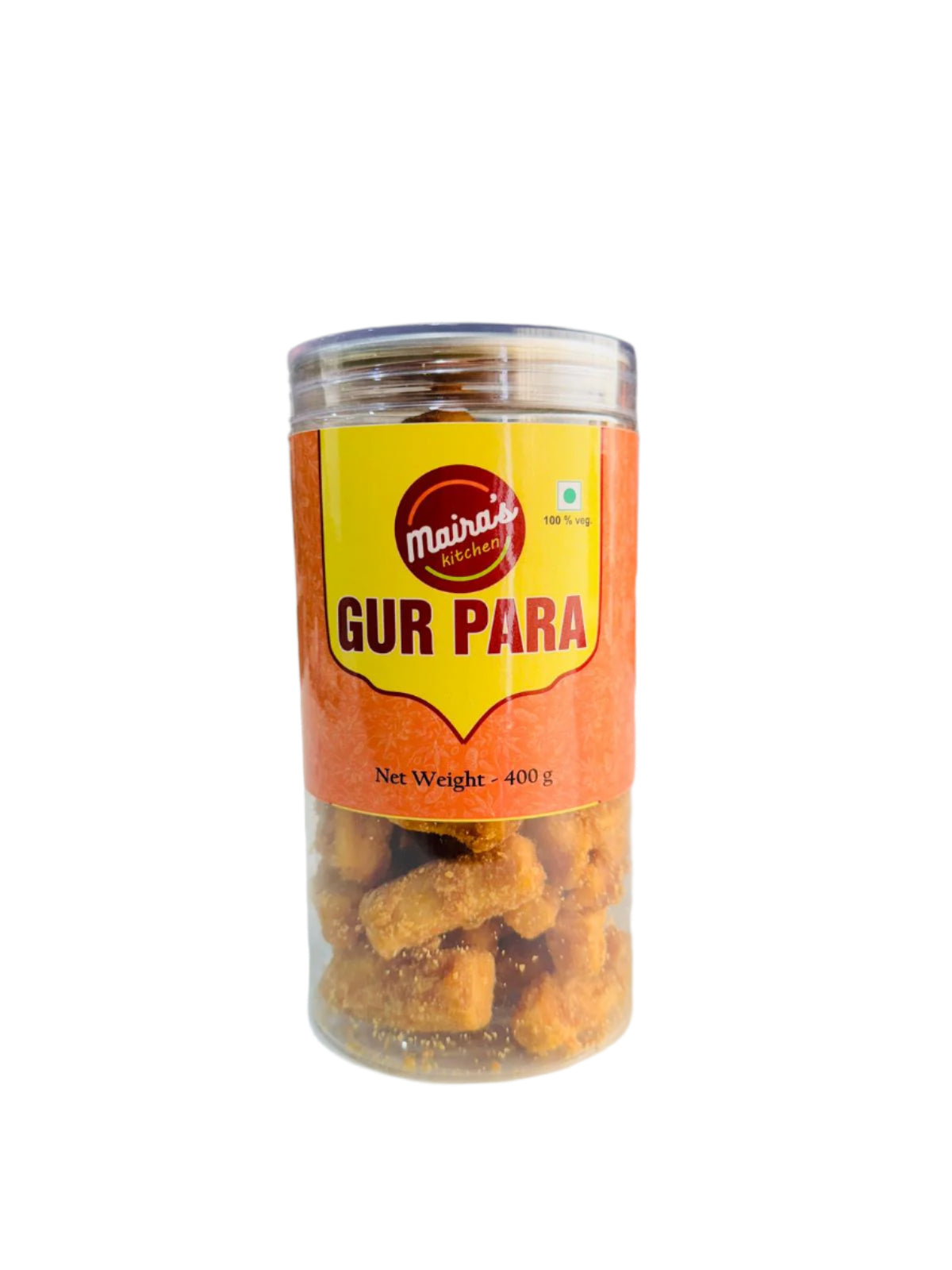 Maira's Kitchen Gur Para 400g at Tales of India. Crispy wheat flour bites coated in jaggery, a traditional Indian sweet snack enjoyed with tea or festivals.