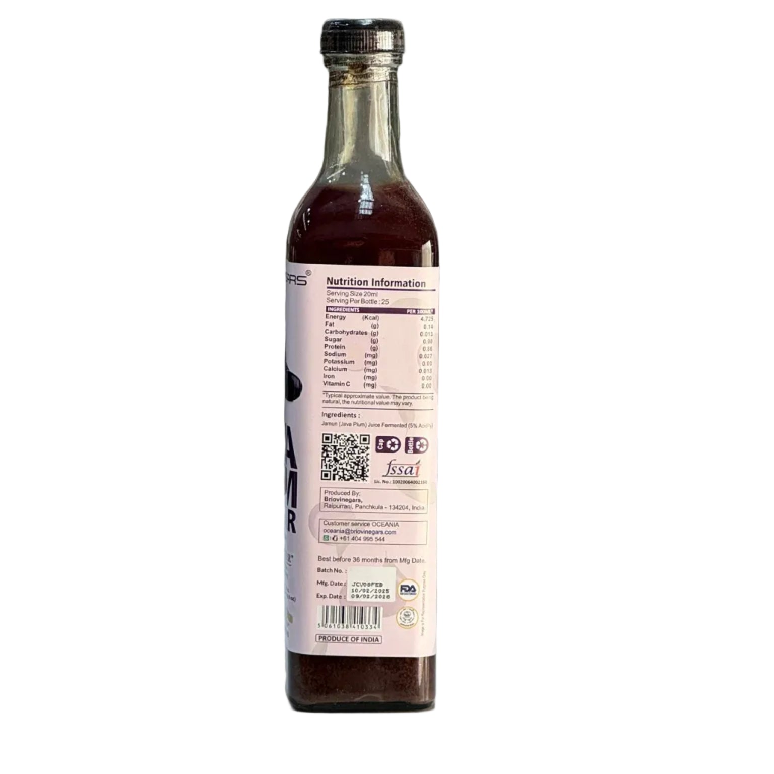 The Brio Java Plum Vinegar (Jamun Sirka) 500ml is a traditionally fermented, natural vinegar known for both culinary and health benefits. It is raw, unfiltered, unpasteurized, and contains the beneficial "mother of vinegar