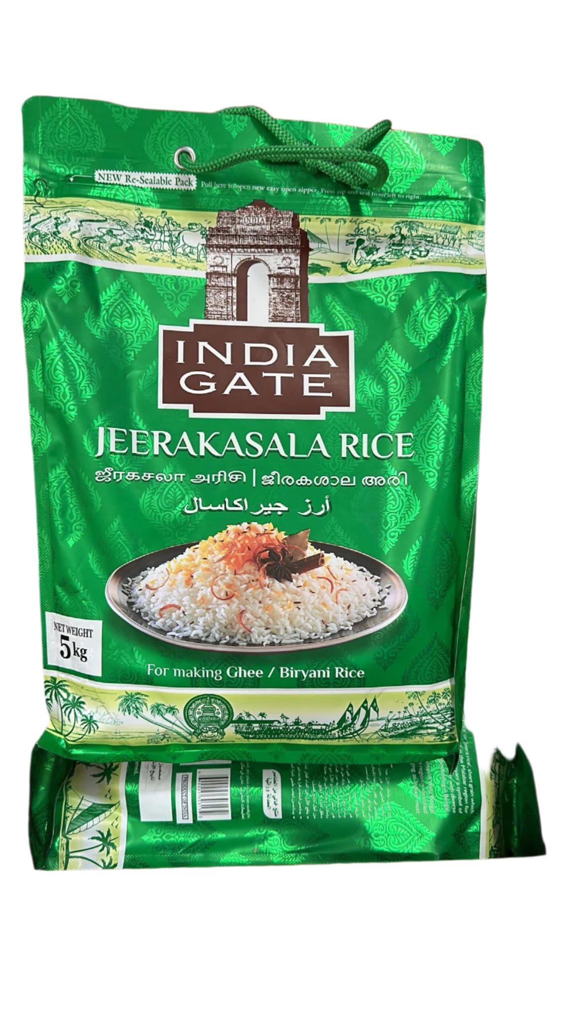 India Gate Jeerakasala Rice 5kg available at Tales of India. Aromatic, short-grained rice perfect for biryanis, traditional Kerala dishes, and festive cooking.