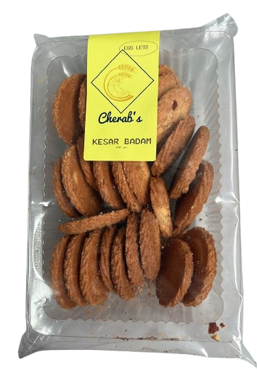 Cherabs Kesar Badam Biscuits 300g available at Tales of India. Flavored with saffron and almonds, these biscuits are perfect for tea-time or gifting.