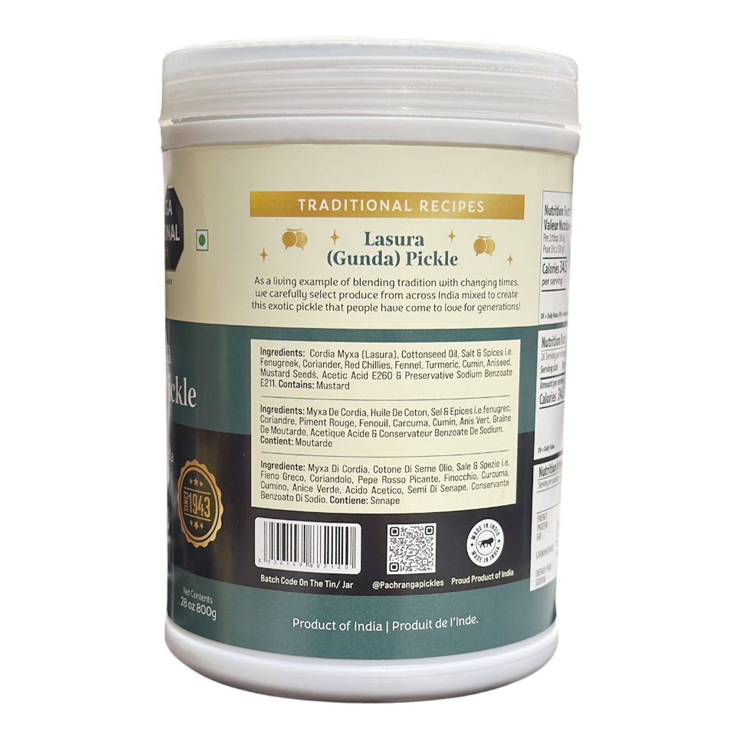 Pachranga's 800g Lasura (Gunda) Pickle is a tangy, tart, and spicy traditional Indian condiment made from handpicked Lasura fruits, a blend of aromatic spices like fenugreek, coriander, and red chili, and cottonseed oil, which provides a natural, healthy indulgence free from artificial colors. This pickle, known for its rich flavor and possible health benefits, is ideal as a flavourful accompaniment to rice, parathas, and other Indian dishes