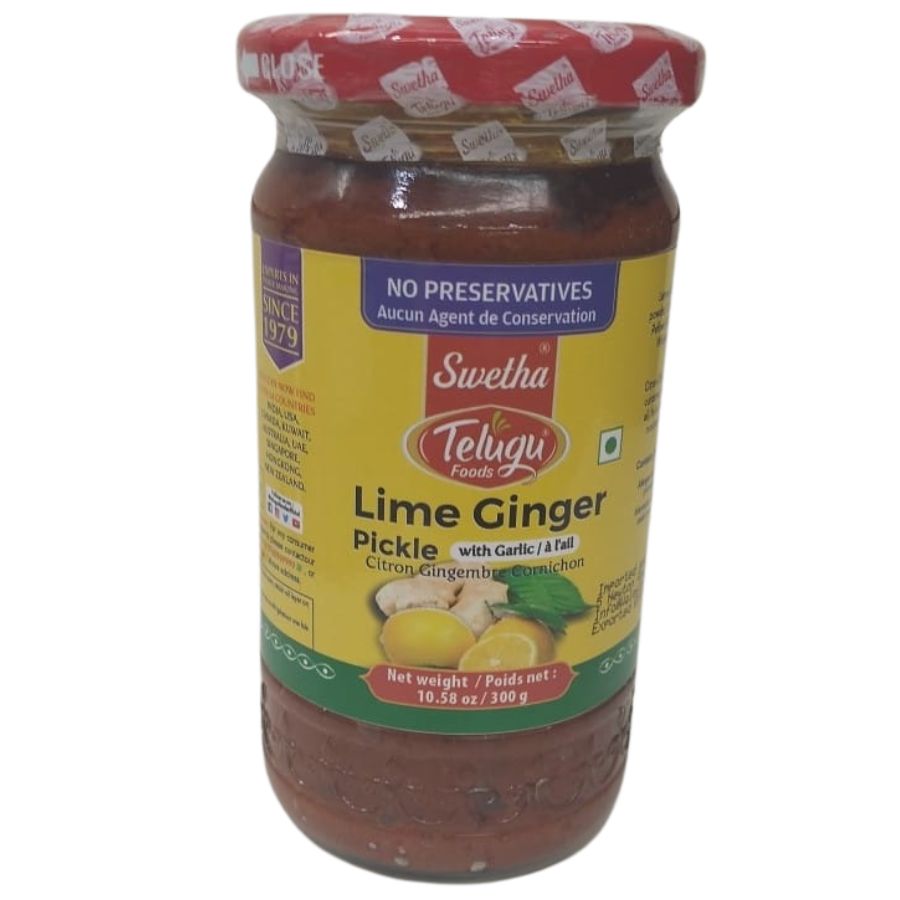 Telugu Foods Lime Ginger Pickle (With Garlic) 300g available at Tales of India. A tangy, spicy South Indian-style pickle made with lime, ginger, and garlic perfect with rice, roti, or snacks.