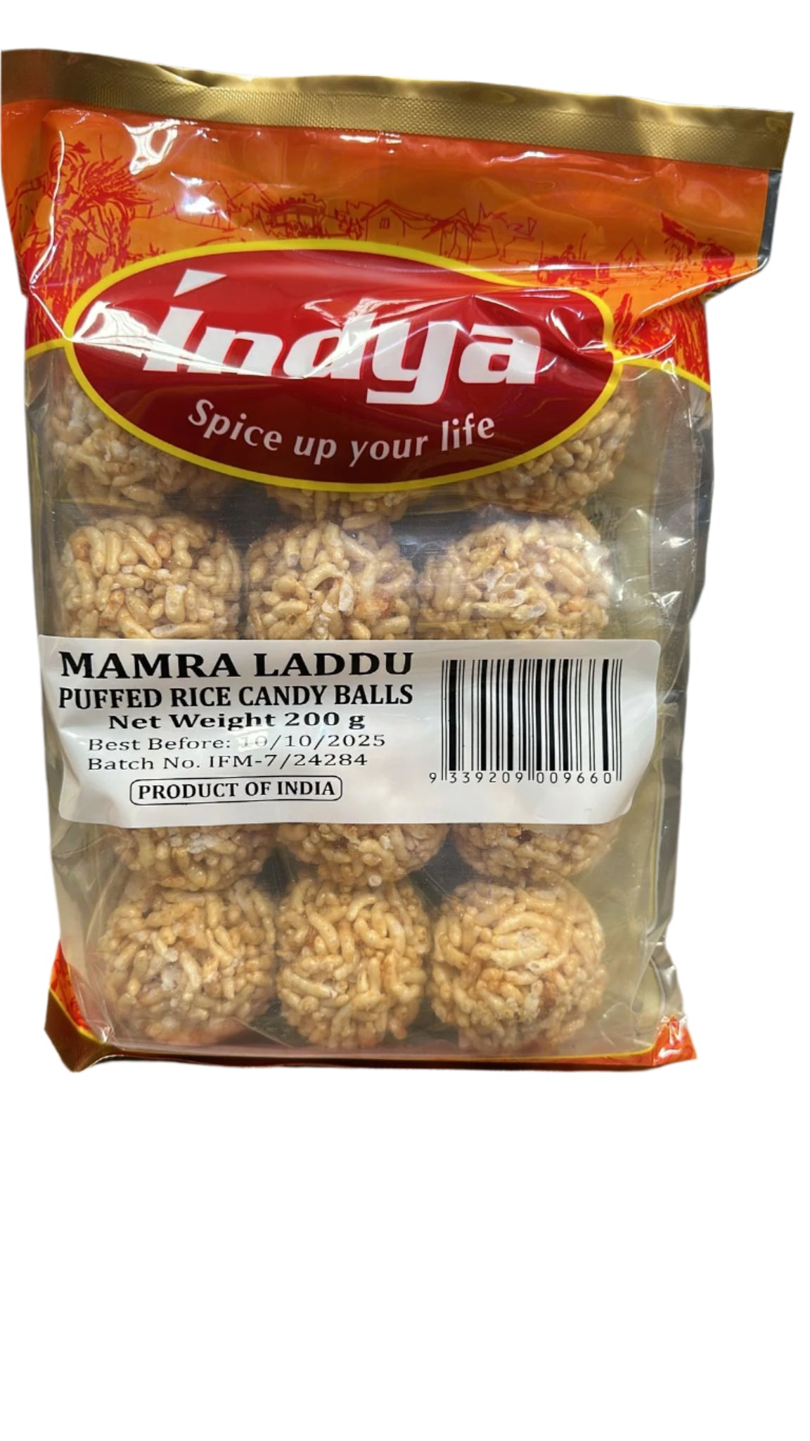 Indya Mamra Ladoo 200g available at Tales of India. Crunchy and sweet puffed rice ladoos made with jaggery – perfect for snacks and festive occasions.