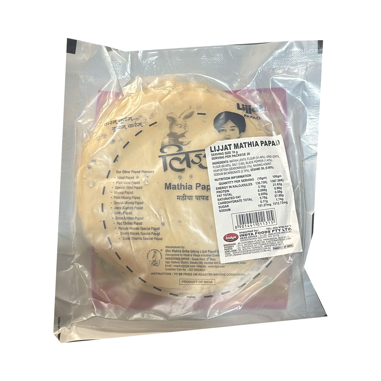 Lijjat Mathia Papad 200g is a specialty Gujarati papad known for its unique texture and flavor, often made during the Diwali festival. While the exact ingredients can vary by product, papads like this typically use lentil flour and spices and can be deep-fried, roasted, or microwaved. They serve as a crispy accompaniment to meals, a standalone snack, or a base for toppings like onions and chilies.