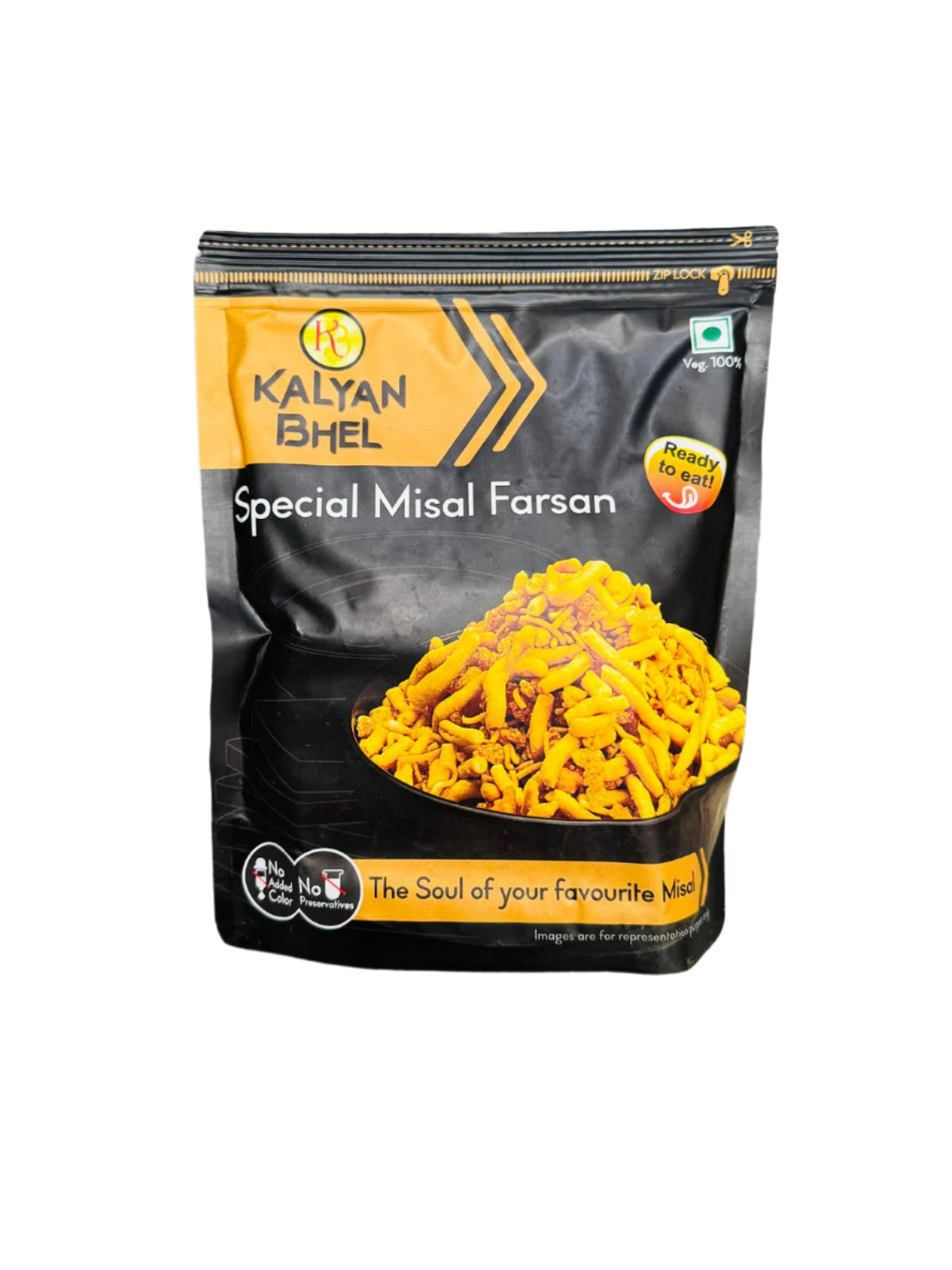 Kalyan Bhel Misal Farsan Bhel 200g available at Tales of India. A crunchy and spicy snack mix perfect for tea-time or as a flavorful munching treat.