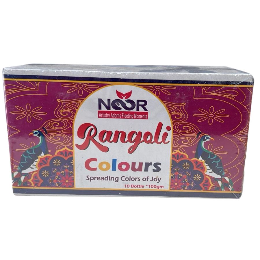 Noor Rangoli Color 10 Bottles available at Tales of India. Bright and vibrant colors ideal for creating beautiful rangoli designs, festive decorations, and artistic crafts.