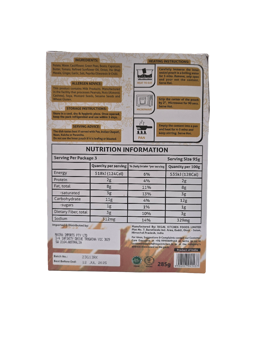 Regal Kitchen Pav Bhaji 285g available at Tales of India. Spicy and flavorful mixed vegetable curry, perfect to serve with pav for an authentic Mumbai street food experience at home.