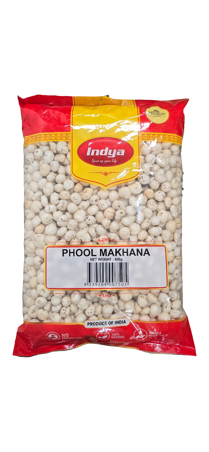 Indya Phool Makhana 400g available at Tales of India. Light, crispy, and protein-rich fox nuts perfect for snacking, roasting, or adding to desserts.