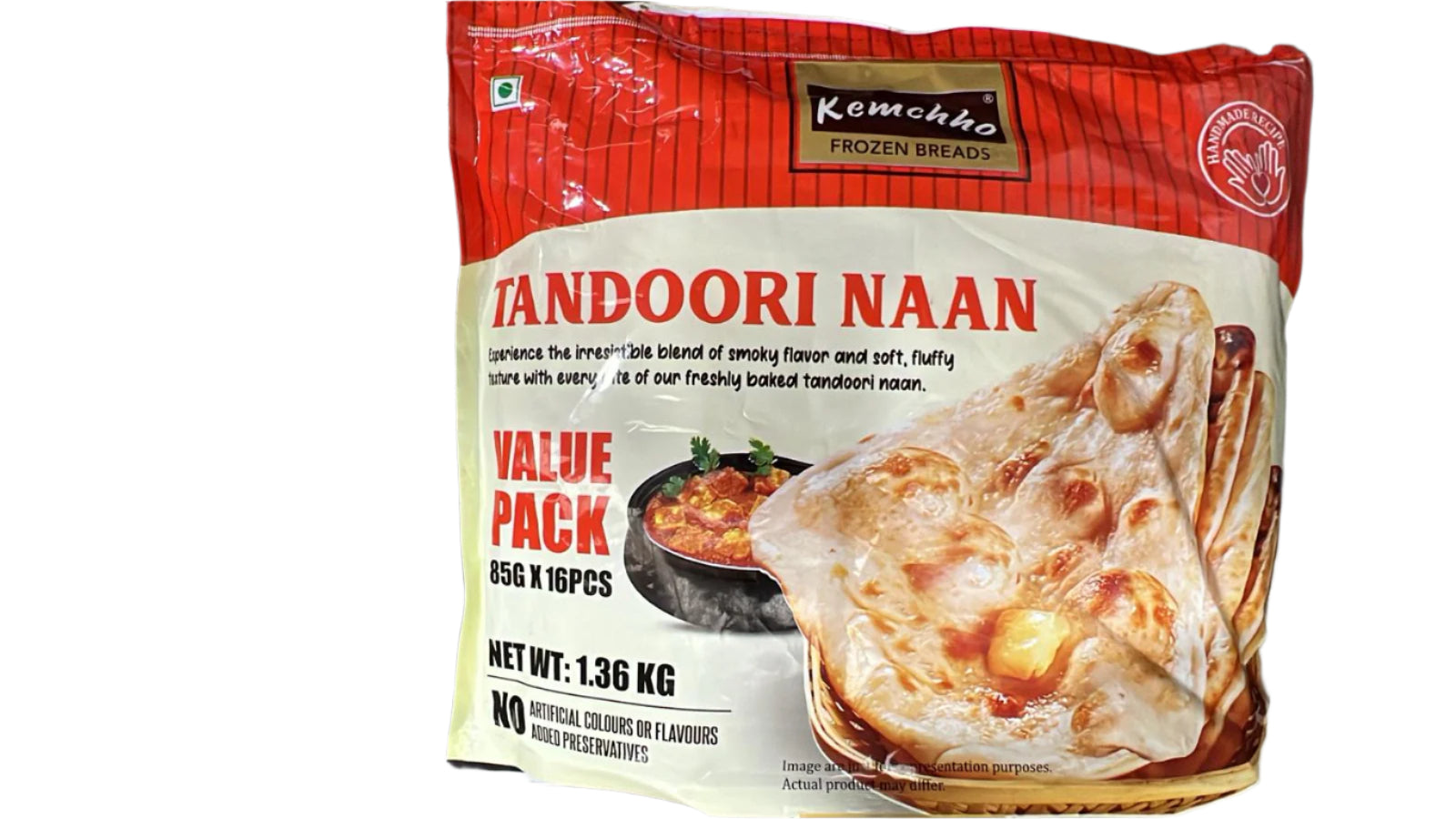 Kemchho Plain Tandoori Naan 16pcs (Frozen Breads) 1.36kg available at Tales of India. Soft and fluffy traditional naan, perfect with curries and Indian meals.