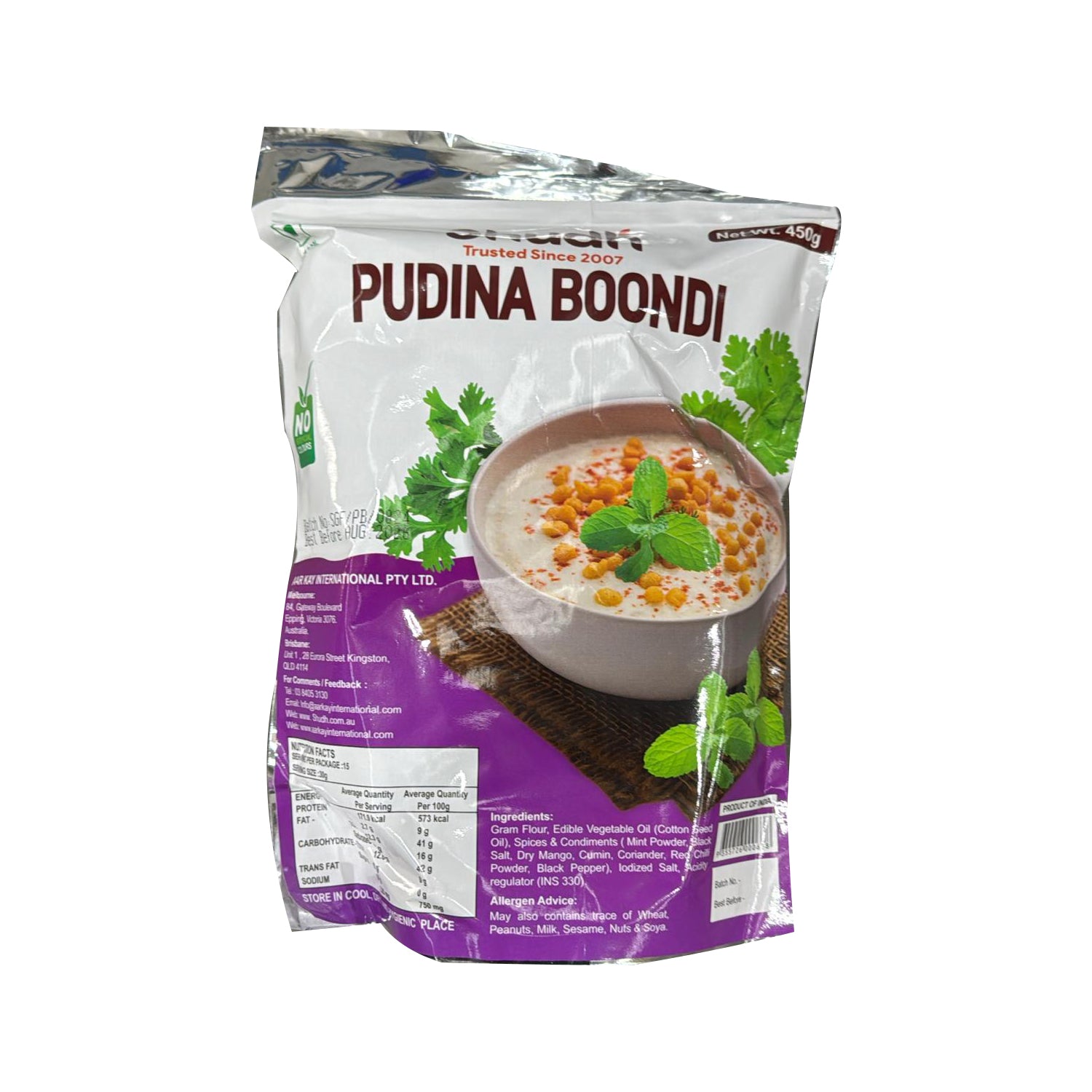 Pudina Boondi 450g from Shudh is a crispy and flavorful Indian snack made with chickpea flour and infused with a refreshing mint (pudina) flavor. It's a popular choice for adding to raita, chaats, or enjoying as a standalone snack. The "Shudh" brand likely emphasizes purity and quality ingredients, making it a healthy and tasty option.