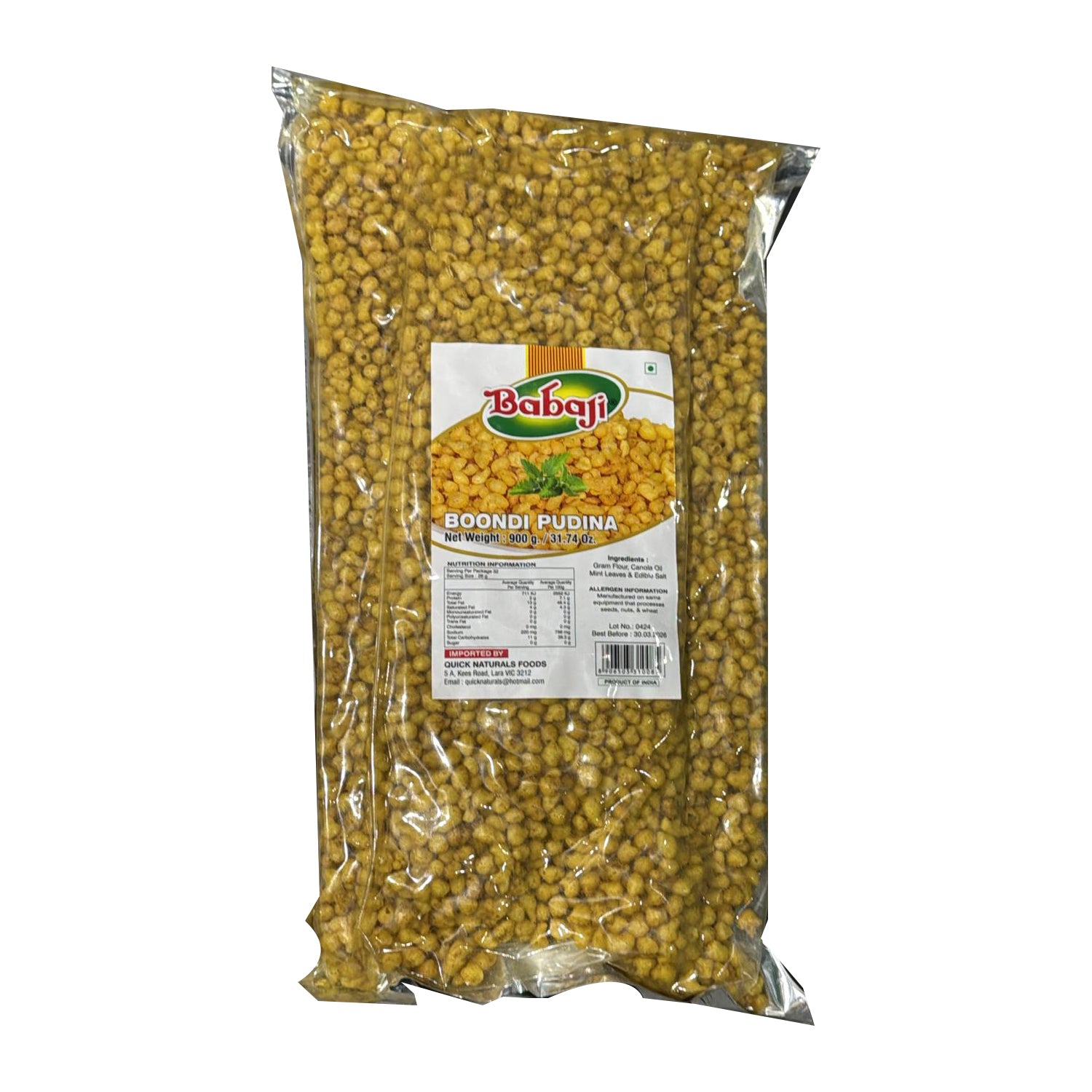 Pudina Boondi 900g - Lajawaab Kitchen. A 900g pack of Pudina Boondi from Lajawaab Kitchen is a popular Indian snack, also known as savory droplets, infused with a crisp mint flavor. It is a versatile namkeen (savory snack) that adds a delightful crunch and a refreshing twist to a variety of dishes and can be enjoyed on its own.