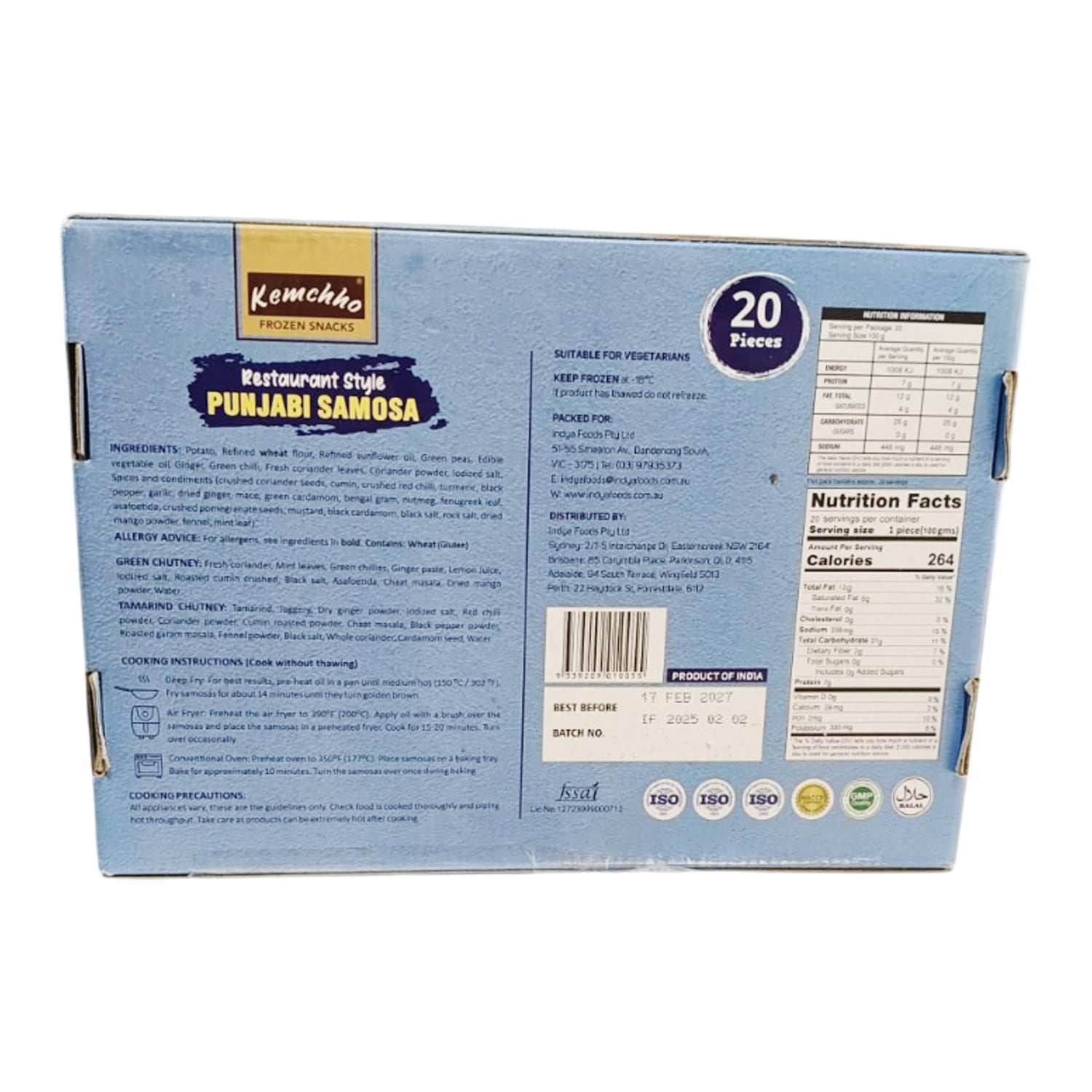 Samosa is one of the most loved tea-time Snack in India. It is a crispy pastry shells with potatoes filling. Now you can enjoy the authentic taste of true Punjabi Samosa with Kemchho Punjabi Samosa. It is in frozen form and is ready to eat by frying or baking. Now enjoy this perfect tea time snack at anytime of the day.