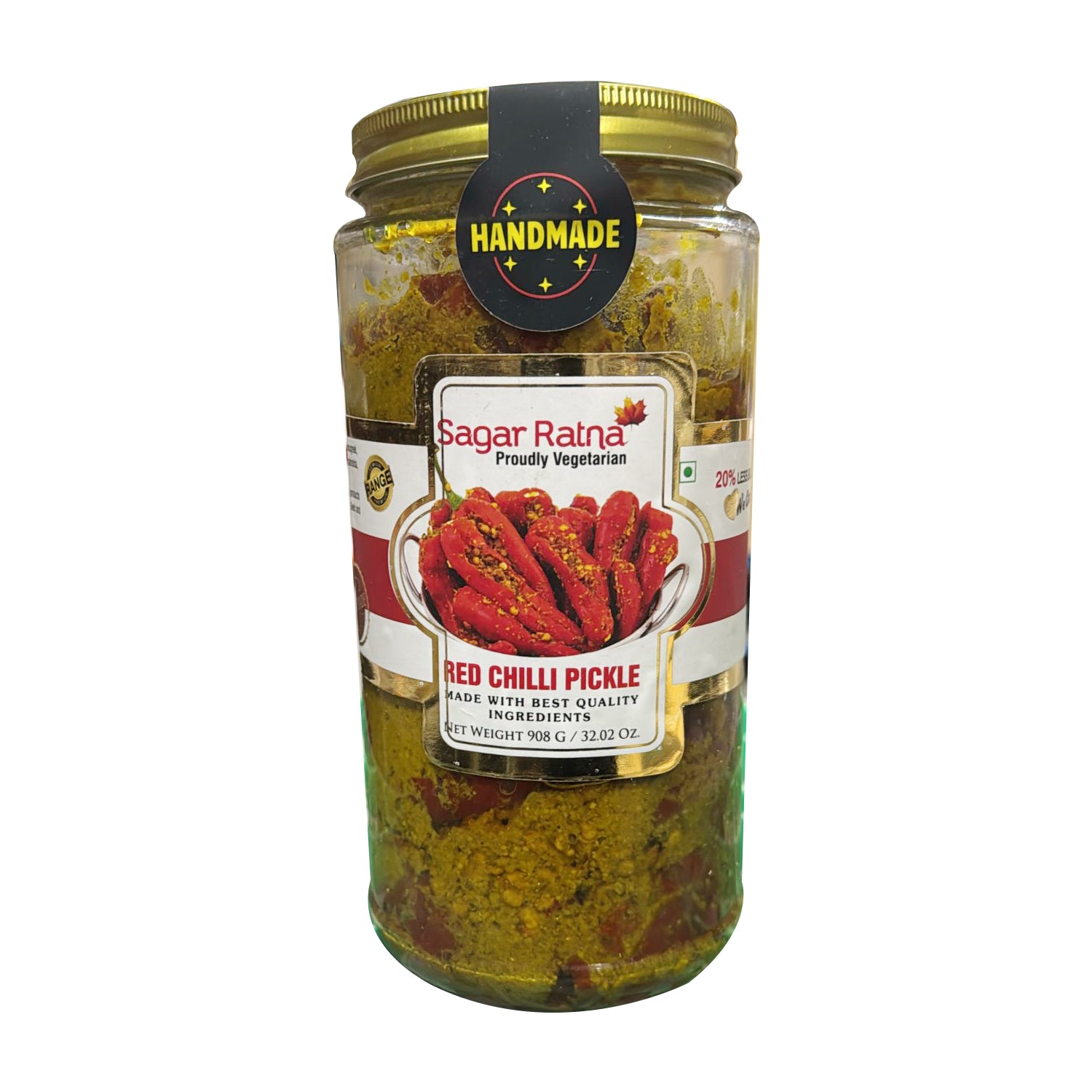 Red Chilli Pickle (Lal Mirch ka Achar) from the brand Sagar Ratna, available in a 908g size, would likely be described as a spicy, tangy, and flavorful traditional Indian pickle. Red Chilli Pickle (Lal Mirch ka Achar) from the brand Sagar Ratna is known for its authentic taste, reflecting the use of quality ingredients and traditional preparation methods. Based on general descriptions of red chilli pickles, it is commonly made by stuffing red chillies with a spicy mix of ingredients and then marinating them in oil, often mustard oil. The specific spices used can vary but often include ingredients like mustard seeds, fenugreek, cumin, coriander, turmeric, salt, and sometimes dry mango powder (amchoor) or asafoetida. The result is a pickle with a bold and vibrant flavor that can add a zing to various Indian meals like parathas, rotis, rice, and dal.