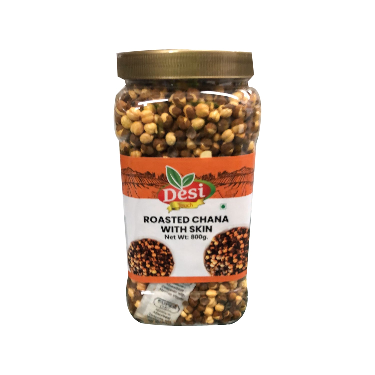 Roasted Chana With Skin 800g - Desi Touch" refers to a 800g pack of whole roasted chickpeas (chana) with their skin on, marketed under the "Desi Touch" brand. These chana are dry-roasted, resulting in a crispy and crunchy texture. They are a popular Indian snack, often enjoyed as a healthy and protein-rich alternative to fried snacks.