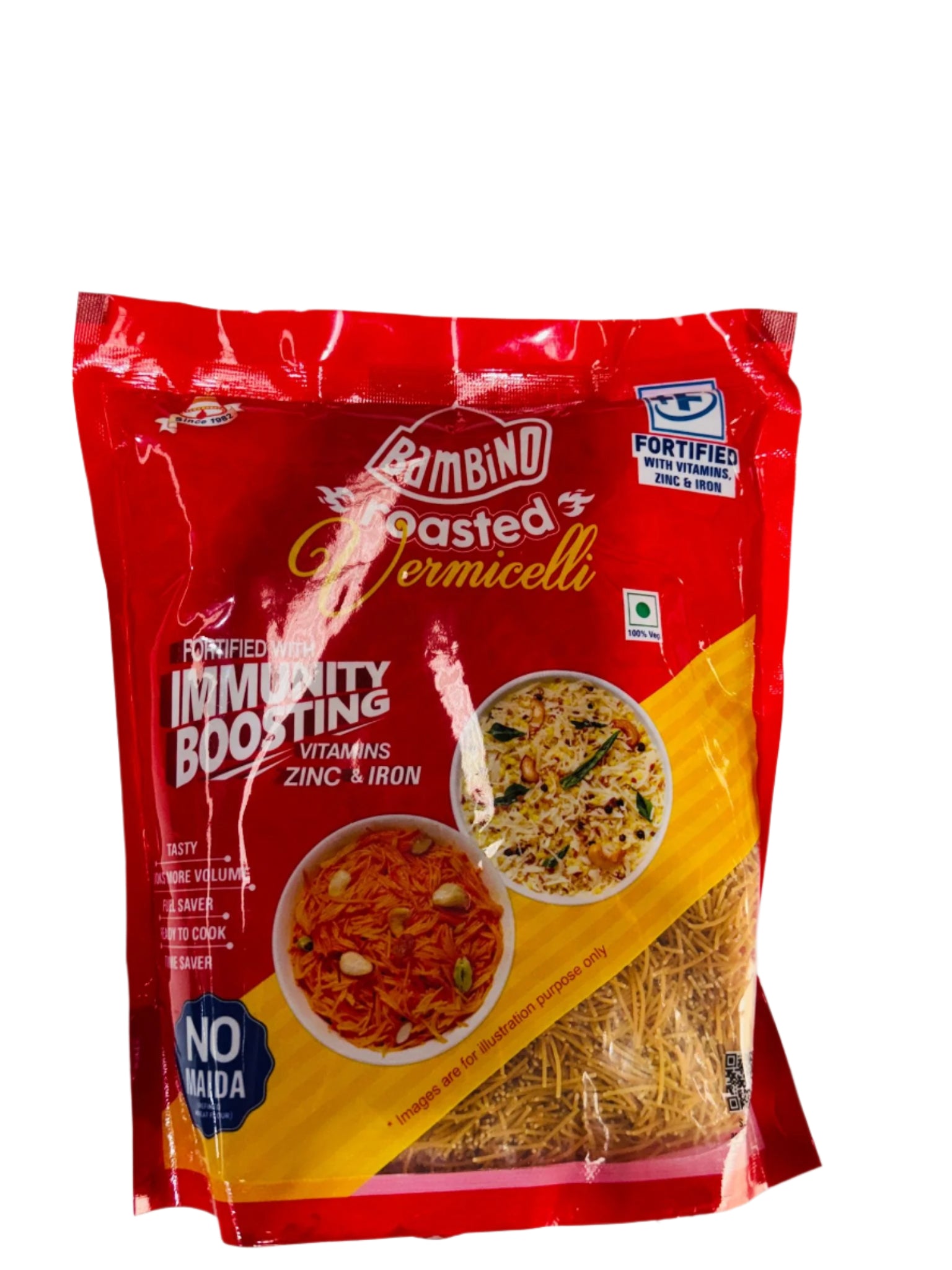 Bambino Roasted Vermicelli (250g pack is available) is a healthy, pre-roasted pasta product made from 100% durum wheat semolina (suji) and is fortified with immunity-boosting vitamins, zinc, and iron. It contains no Maida or artificial additives, making it a nutritious and wholesome option