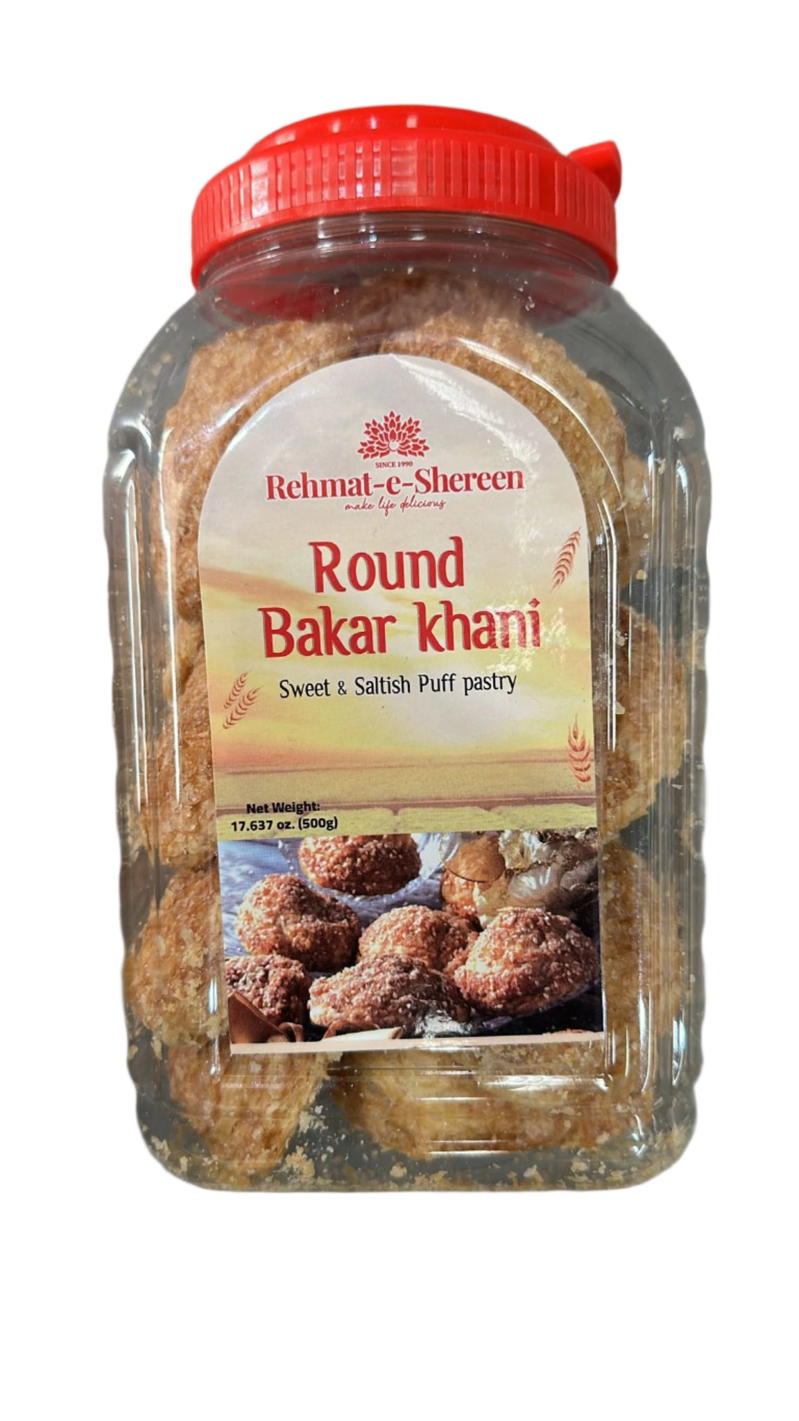 Rehmat-e-Shereen Round Bakar Khani 500g available at Tales of India. A crispy, flaky puff pastry with a perfect sweet and saltish taste, ideal for tea-time.