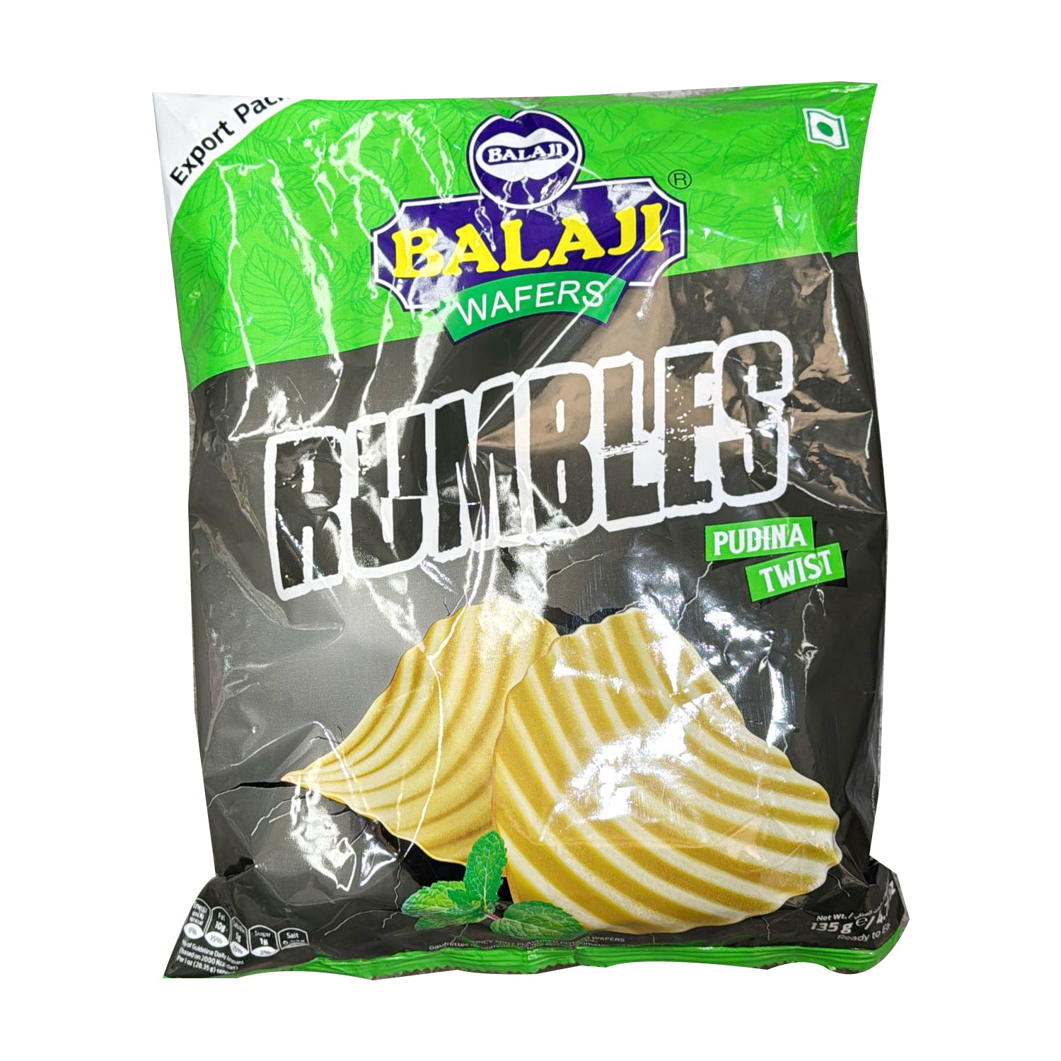 Balaji's Rumbles Pudina Twist 135g potato chips offer a refreshing and savory snacking experience. These chips are characterized by their crispy texture and a distinctive mint flavor, providing a unique twist on the classic potato chip. They are perfect for a quick snack or while on the go, delivering a delightful combination of crunch and a cool, minty taste