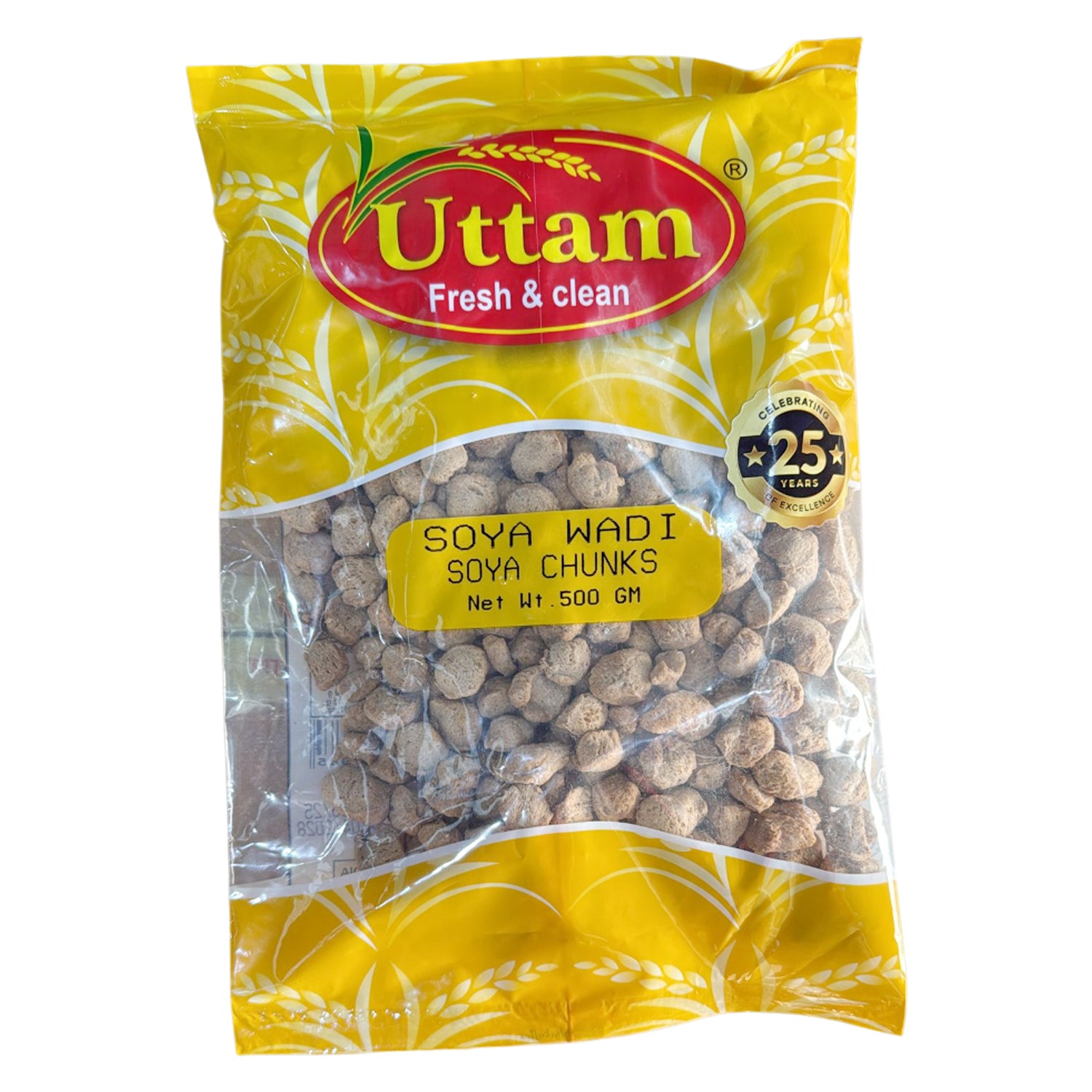 Uttam Soya Wadi (Chunks) is a 500g pack of high-protein, plant-based soy chunks made from soy flour, marketed as a versatile and nutritious ingredient for vegetarian dishes like curries, stir-fries, and pulao. It is designed to be a healthy alternative to meat, suitable for fitness enthusiasts, and is known for absorbing flavors well. The product should be stored in a cool, dry place