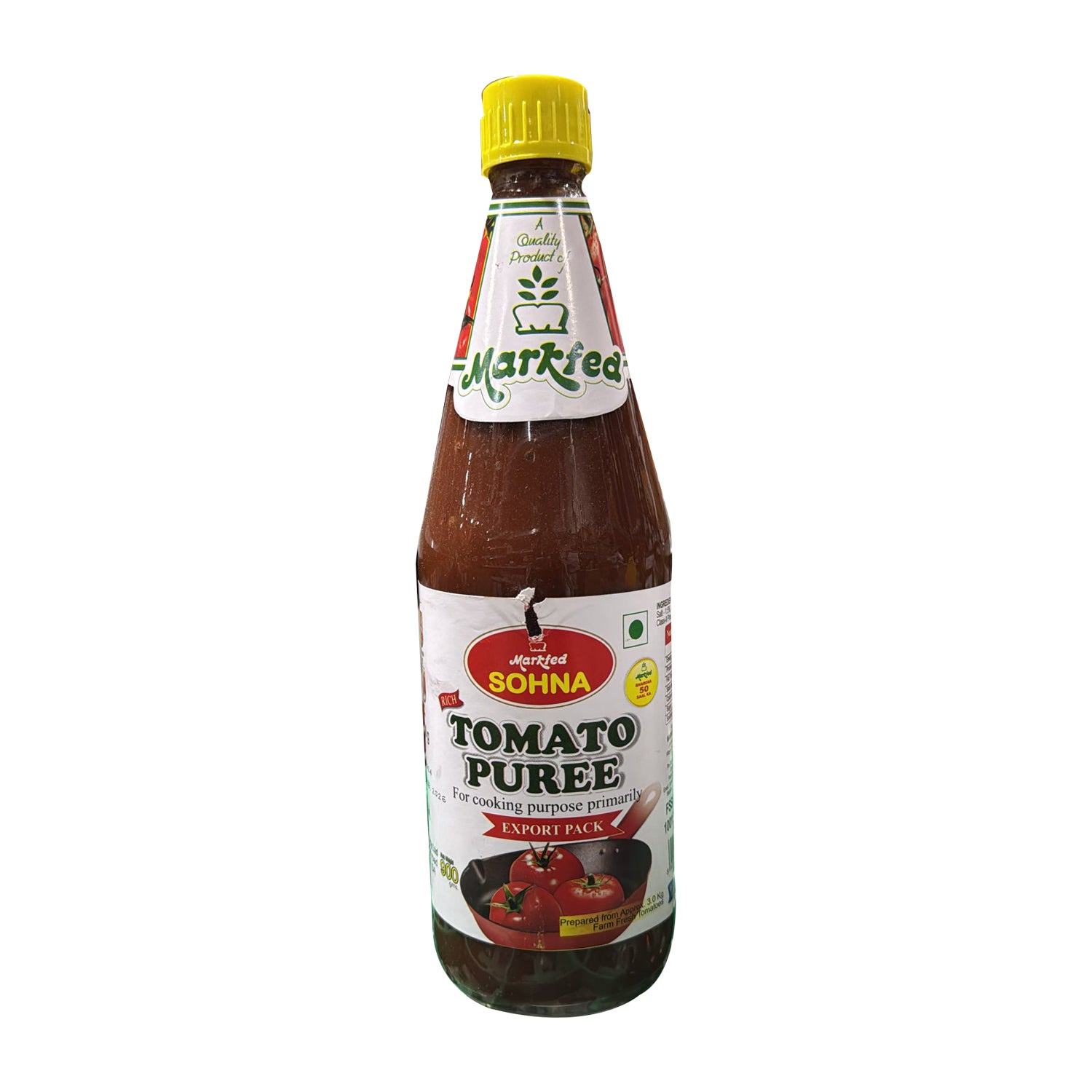 Sohna Tomato Puree is a product made from farm-fresh, ripe tomatoes, typically weighing around 2.5 kg to produce 900g of puree. It boasts a high tomato content of 98.47%. The ingredients usually include tomato, tamarind, jaggery, sugar, iodized salt, spices, and condiments