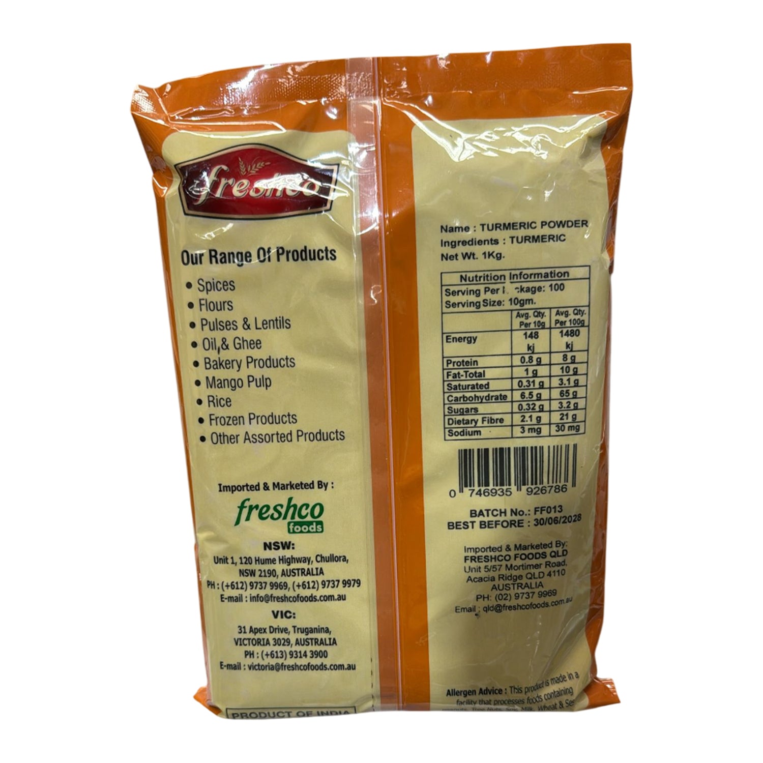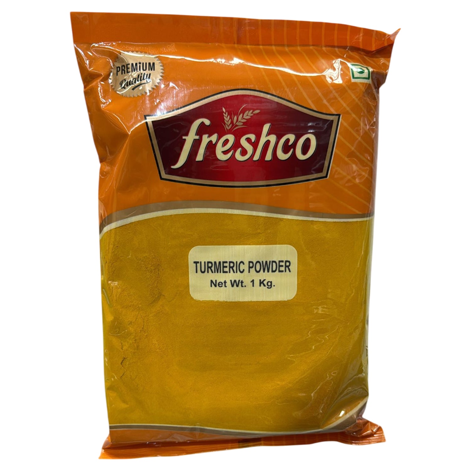 Freshco Turmeric Powder is a high-quality spice made from fine-quality Indian turmeric, processed for its rich flavor, color, and aroma. It is hygienically packed, free from added preservatives, colors, or flavors, and is used to add pungency and richness to dishes. The powder is finely ground to preserve its natural qualities and is described as having an earthy, mild taste