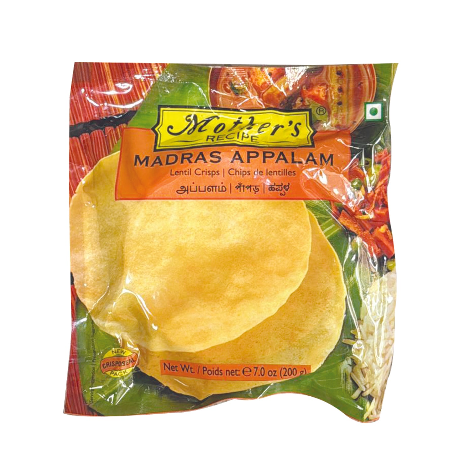 Mothers Recipe Appalam Papad, 200 gms (Mixed lentil & rice flour crisp seasoned with salt & coconut oil, authentic traditional recipe) Mother’s recipe Appalam is made with best quality udad dal, rice flour and salt. The taste of this appalam does justice to the age old traditional recipe and is made using modern process giving it a unique flavour & crispiness