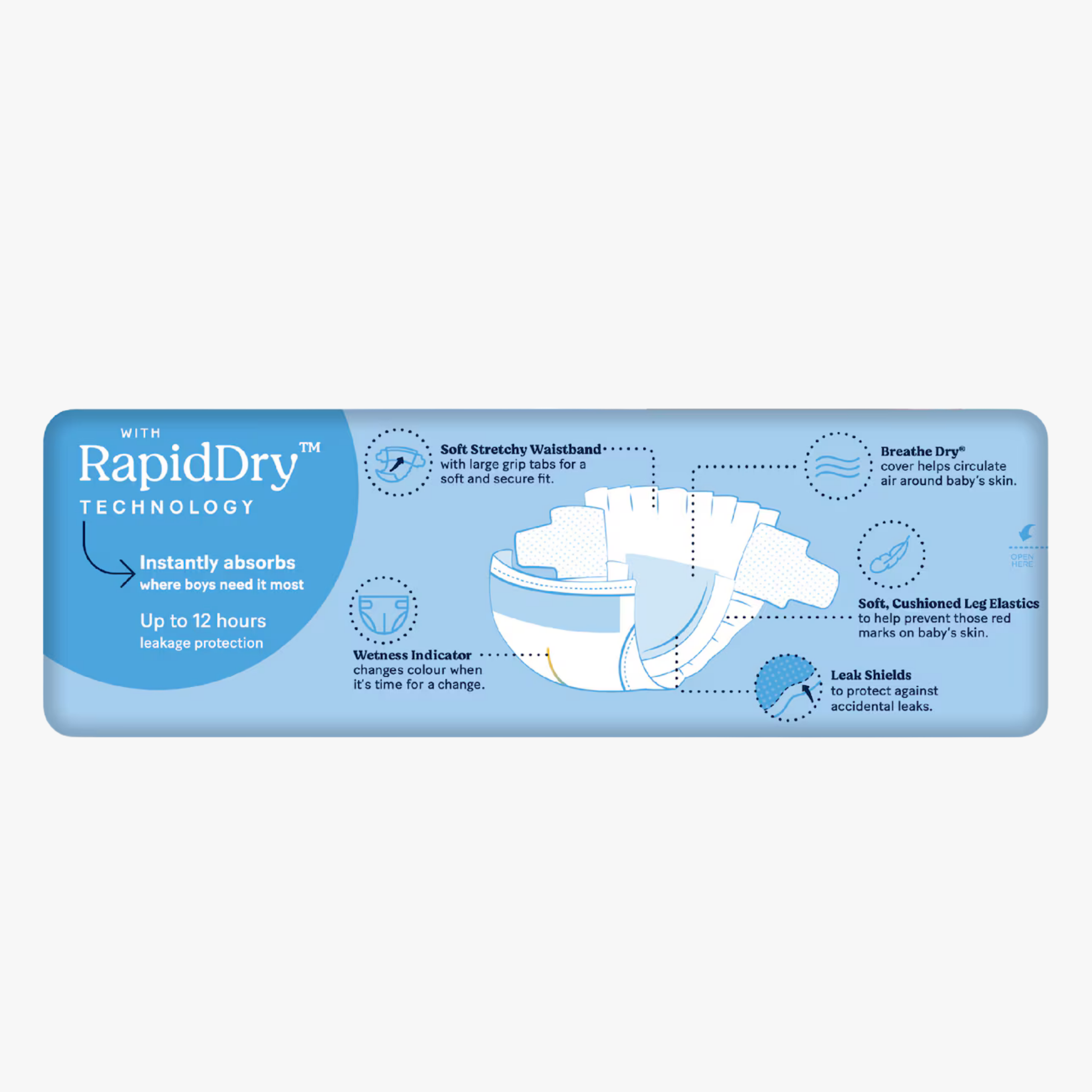 • Breathable Breathe Dry cover and Leak Shield side guards work together to keep skin dry and reduce accidental leaks