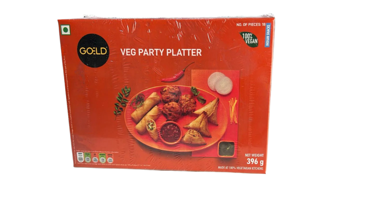 Goeld Veg Party Platter 396g – a delicious mix of vegetarian party snacks, ready to serve and enjoy. Shop frozen snacks online at Tales of India.