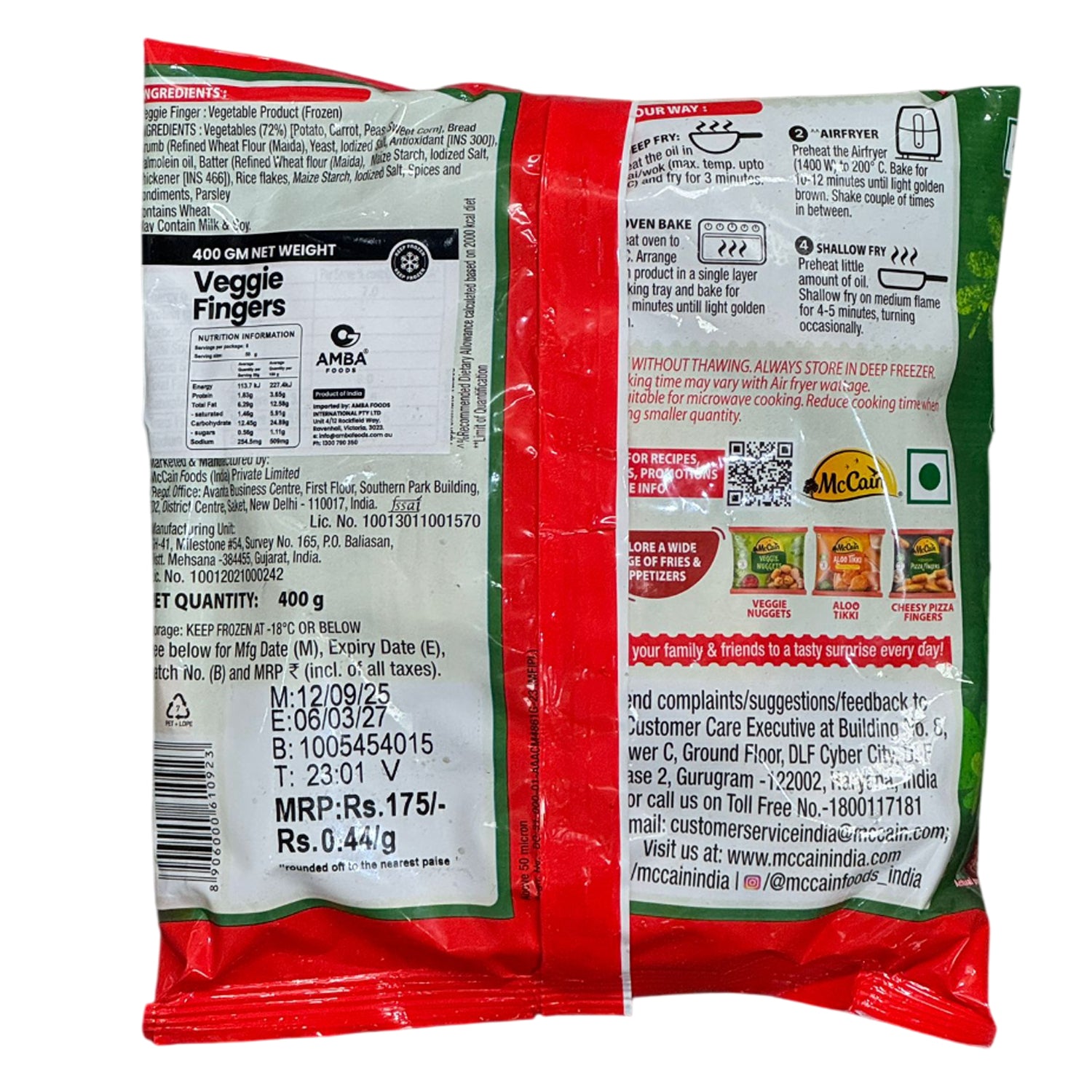 McCain Veggie Fingers (400g) are crispy, golden-brown vegetarian snacks made from a blend of mashed potatoes and vegetables like corn, carrots, and peas, seasoned with spices and coated in breadcrumbs for a nutritious, easy-to-cook treat perfect for kids and adults, served as a snack or side dish. They're designed for quick preparation in an oven, air fryer, or deep fryer, offering a tasty way to enjoy more vegetables. .